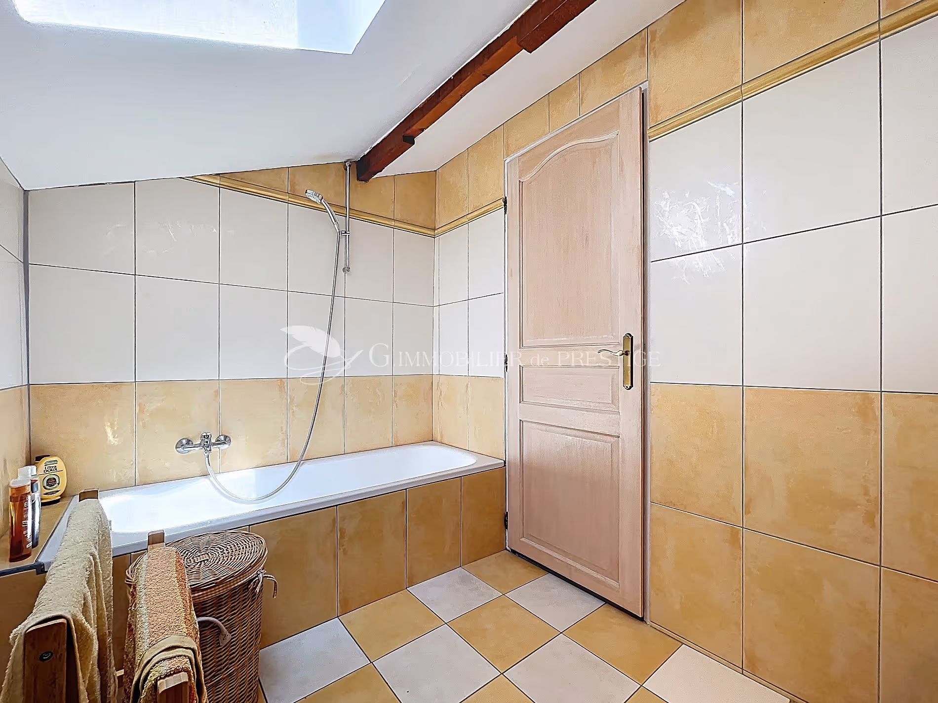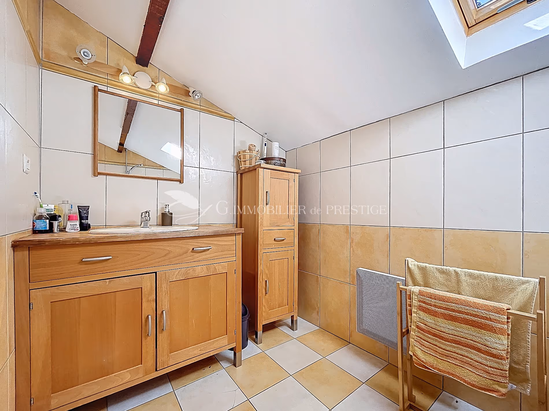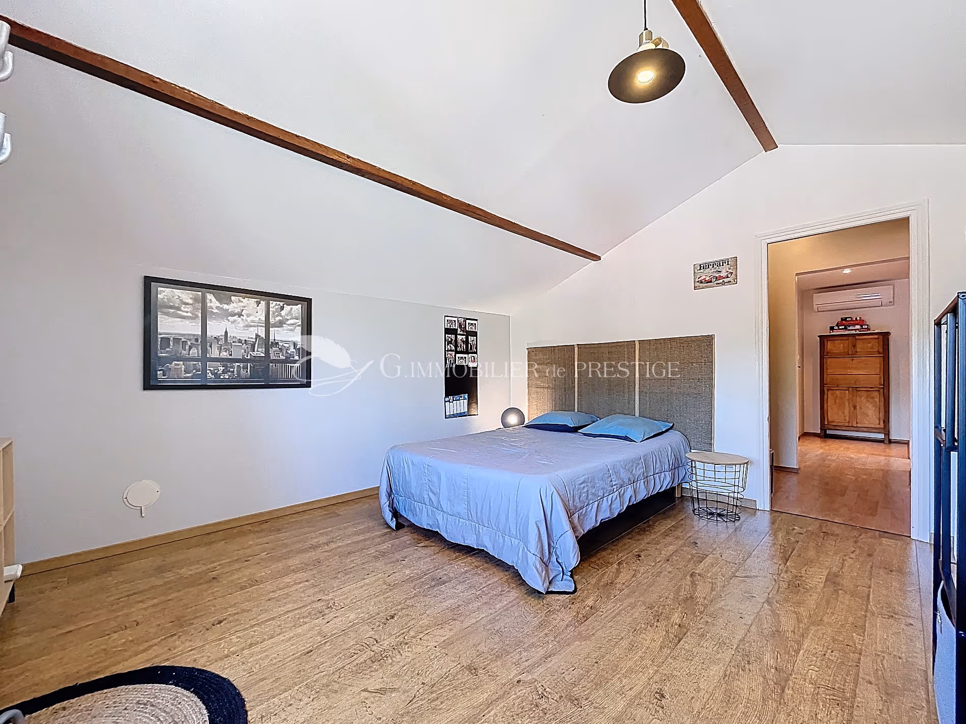 A l'étage, un espace parent (ou adolescent) de 32m² avec une grande chambre mansardée, un dressing, des toilettes et une salle de bains.