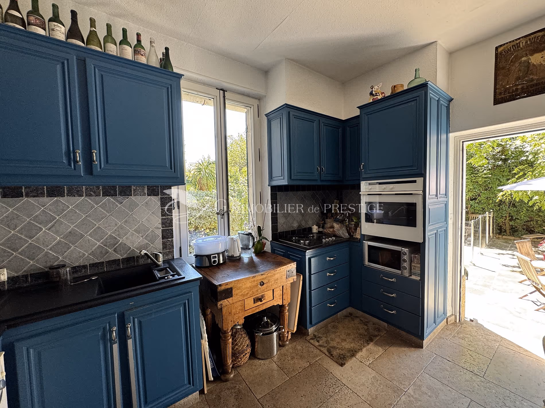 Une jolie cuisine donne directement sur une terrasse ombragée agrémentée d'une belle fontaine. Là une pause autour de la table ou sur les transats le regard happé vers le cèdre majestueux.