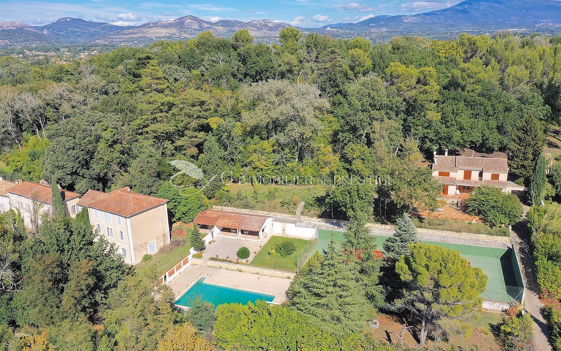 cette belle propriété se compose d'une bâtisse provençale à restaurer en partie de 745 m2 environ, une villa, une piscine et un tennis sur 4 hectares et demi de terrain.