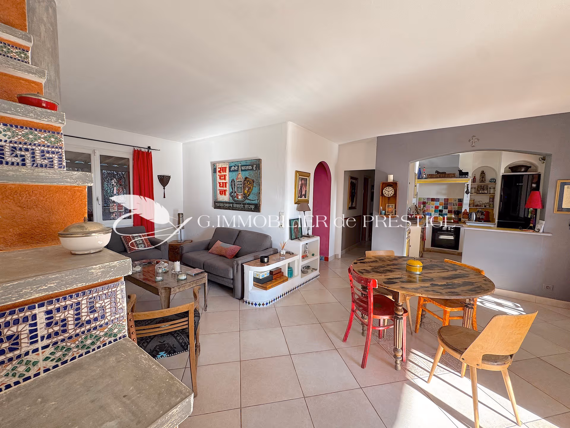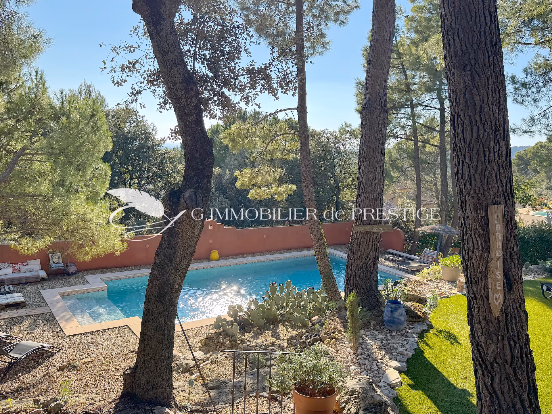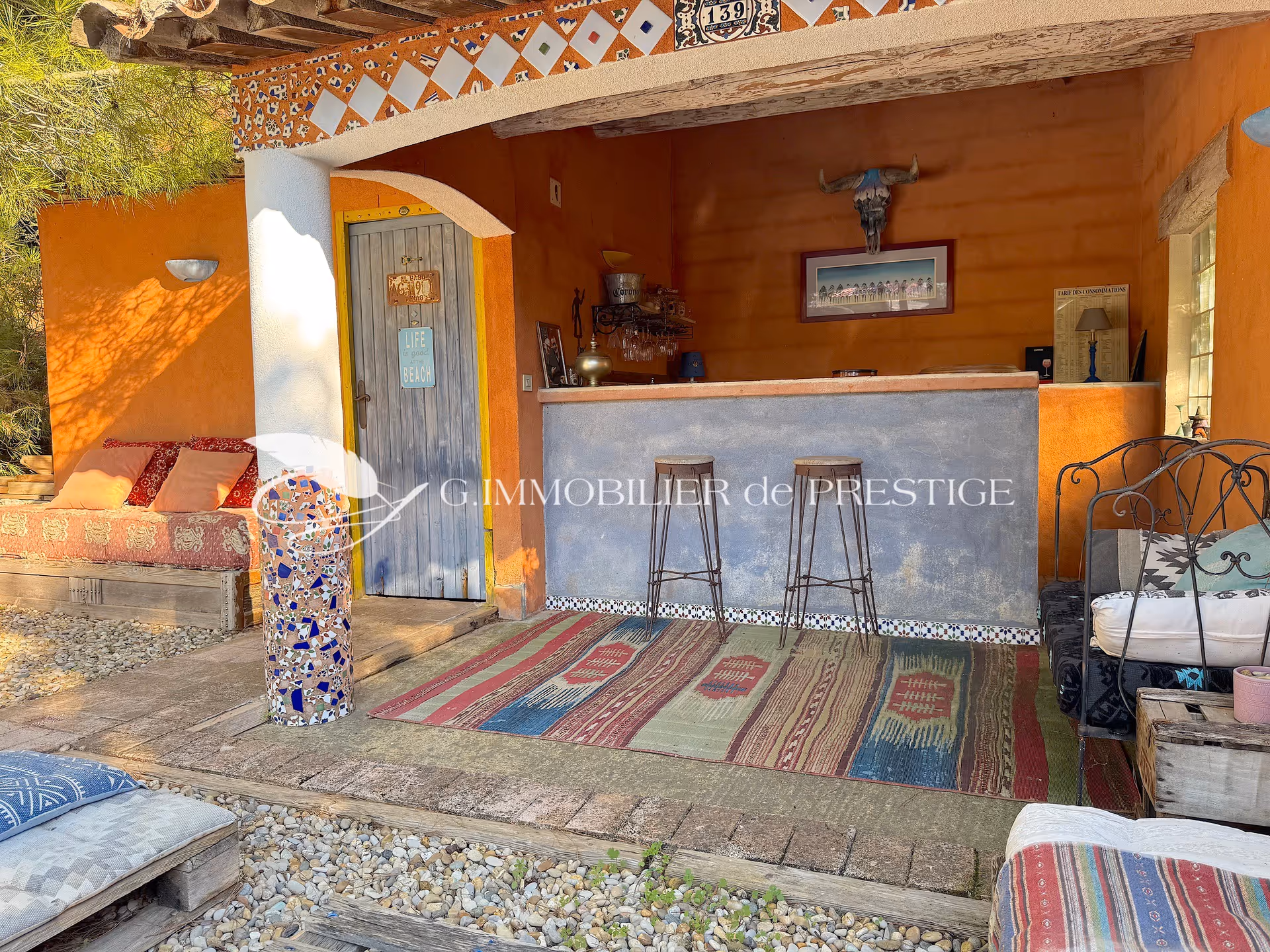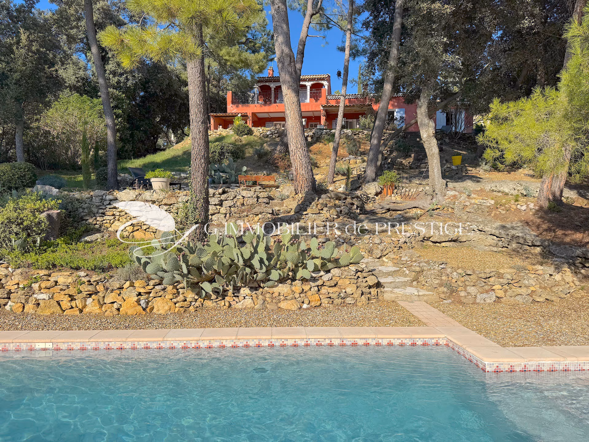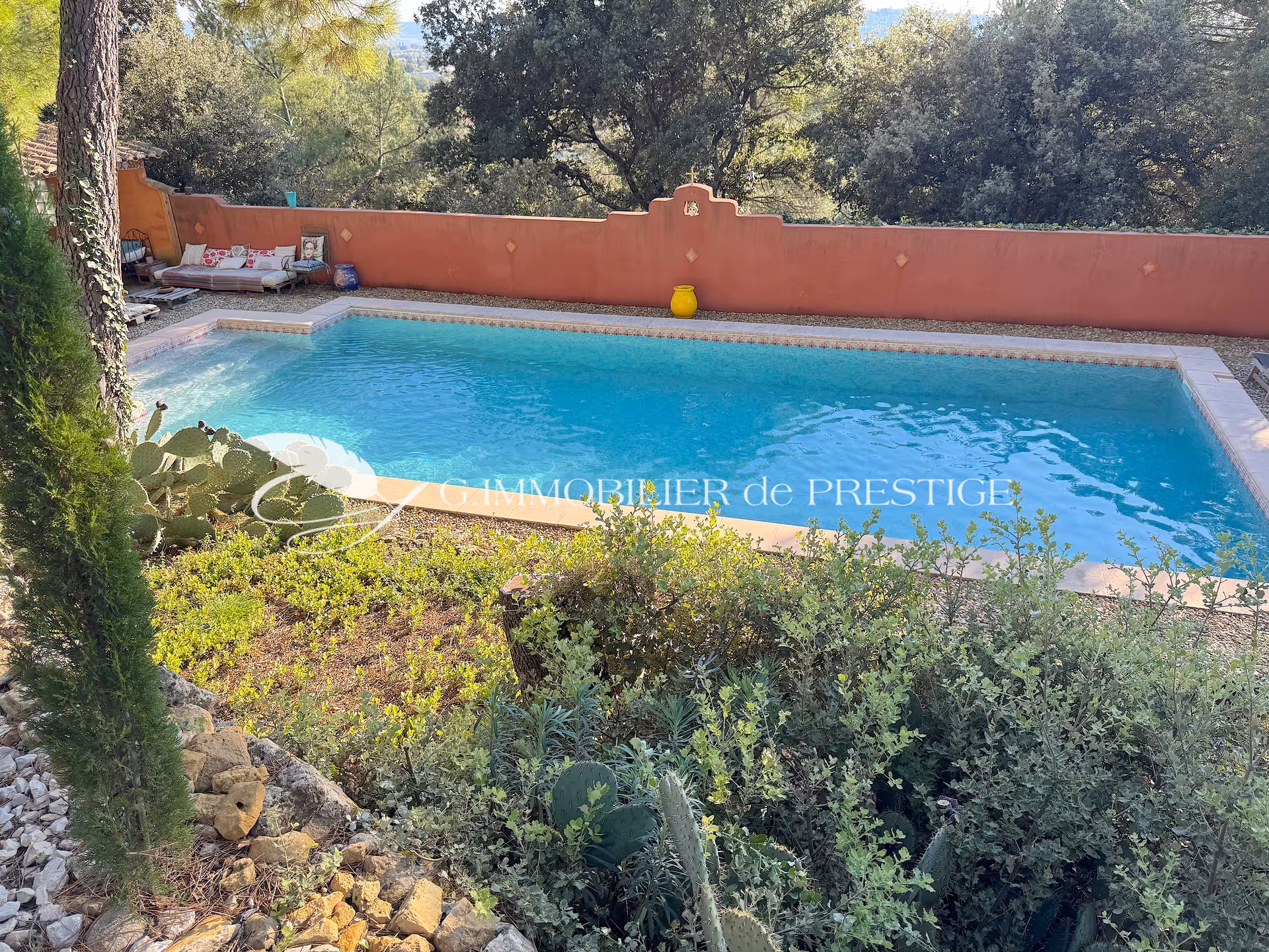 Implantée sur un terrain paysagé de pins, chênes, essences méditerranéennes et rocailles, elle s'ouvre sur une belle piscine bordée de murets en pierre sèche, prolongée par une cuisine d'été à l'ambiance latino avec bar d'été, tapis colorés et détails en mosaïque artisanale.