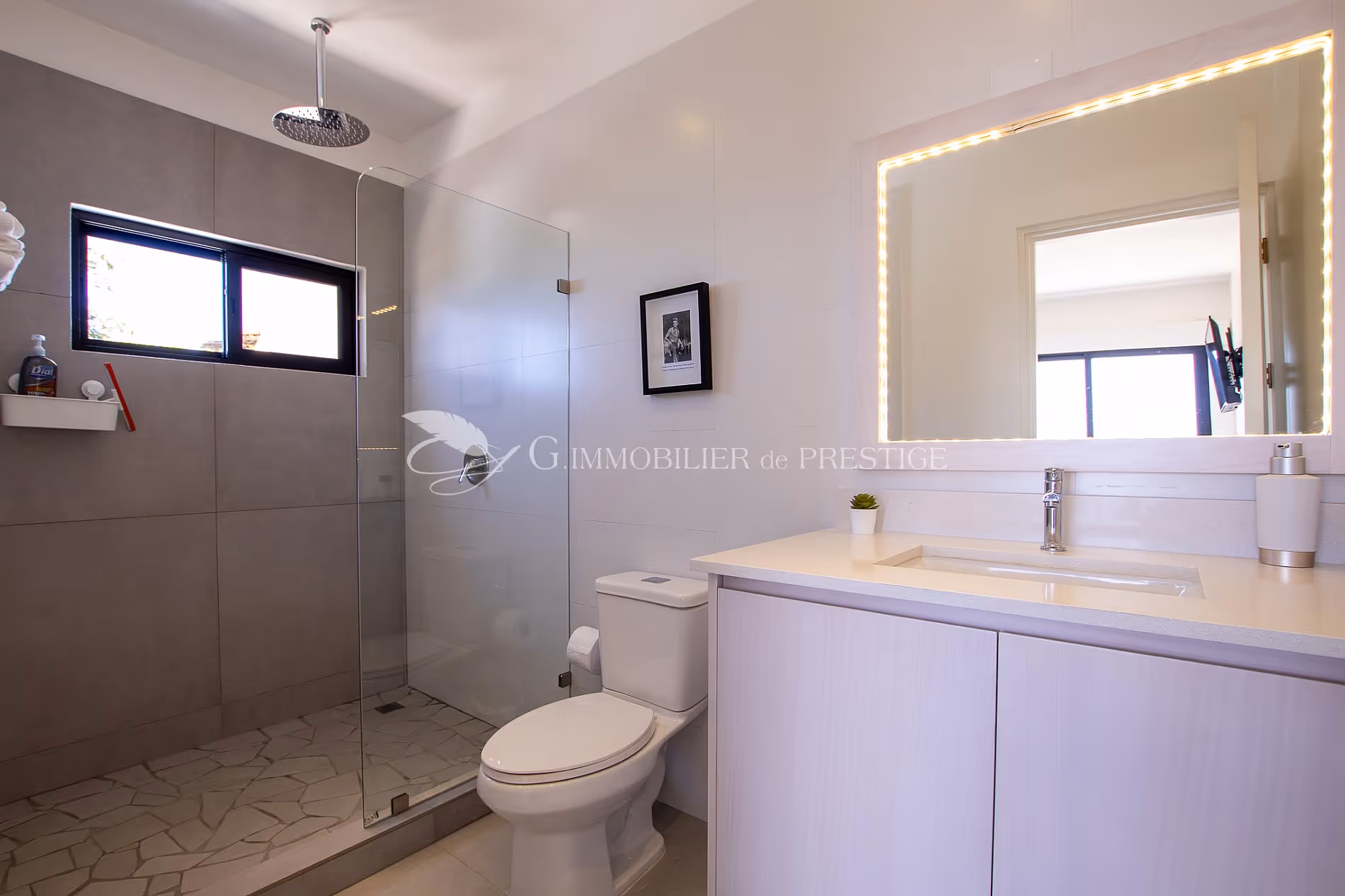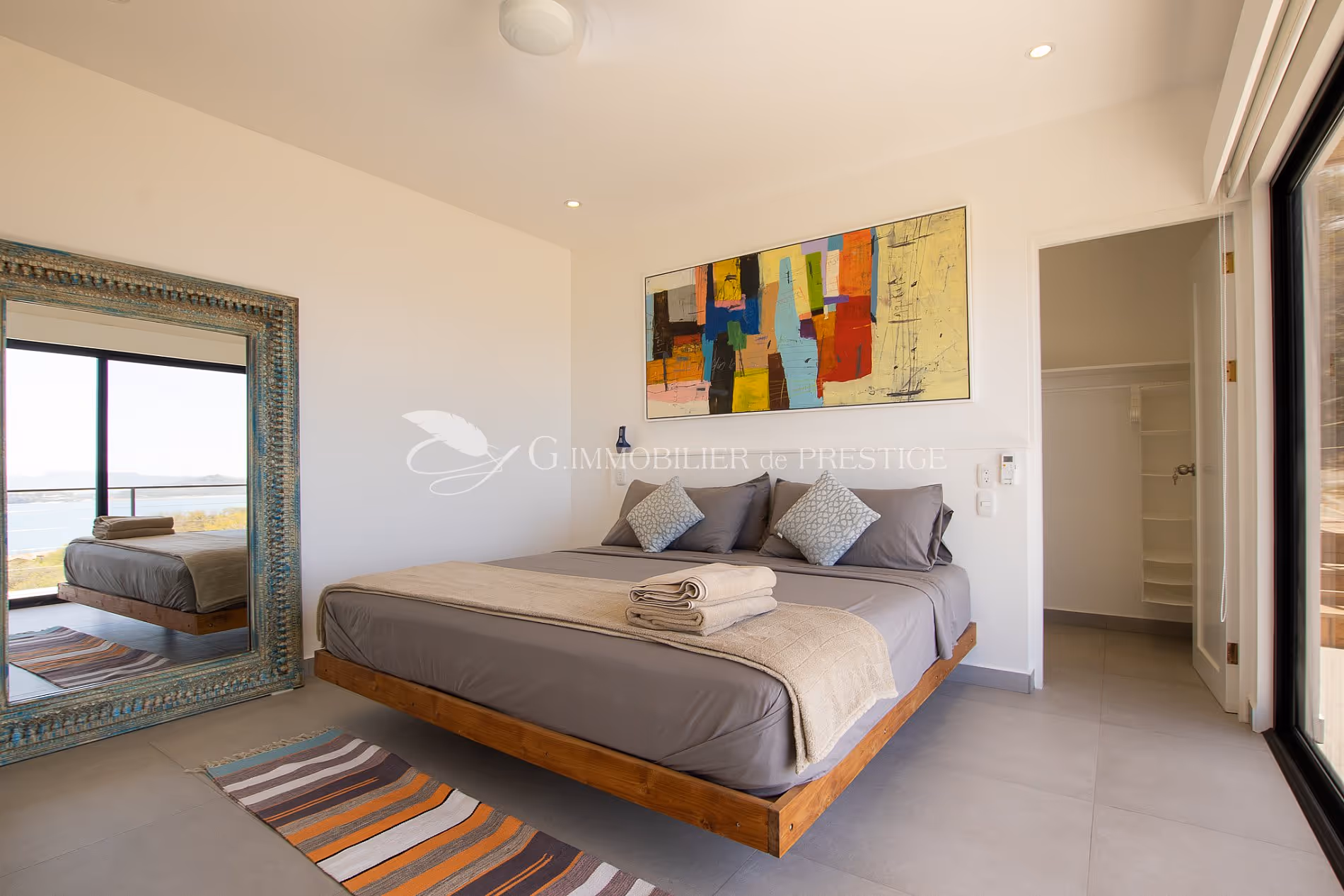 La premiere maison d'une superficie intérieure de 160m2 possède 3 chambres, 2 ,5 salle de bain, une lavanderie. Meublée avec goût, totalement rénovée, une terrasse en teck de plus de 100m2, face à la mer et sa piscine en pierre