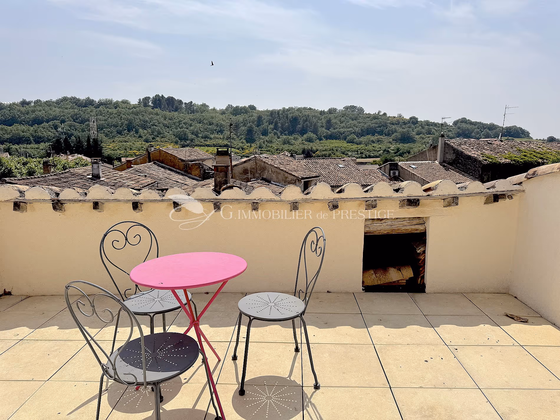 Une terrasse au dernier niveau au-dessus des toits permet de profiter de la vue des collines et du clocher en fond de carte postale.