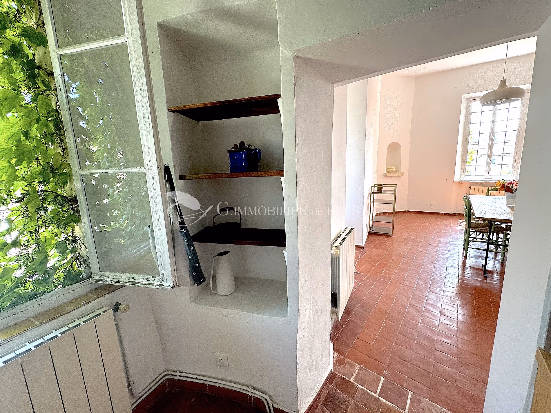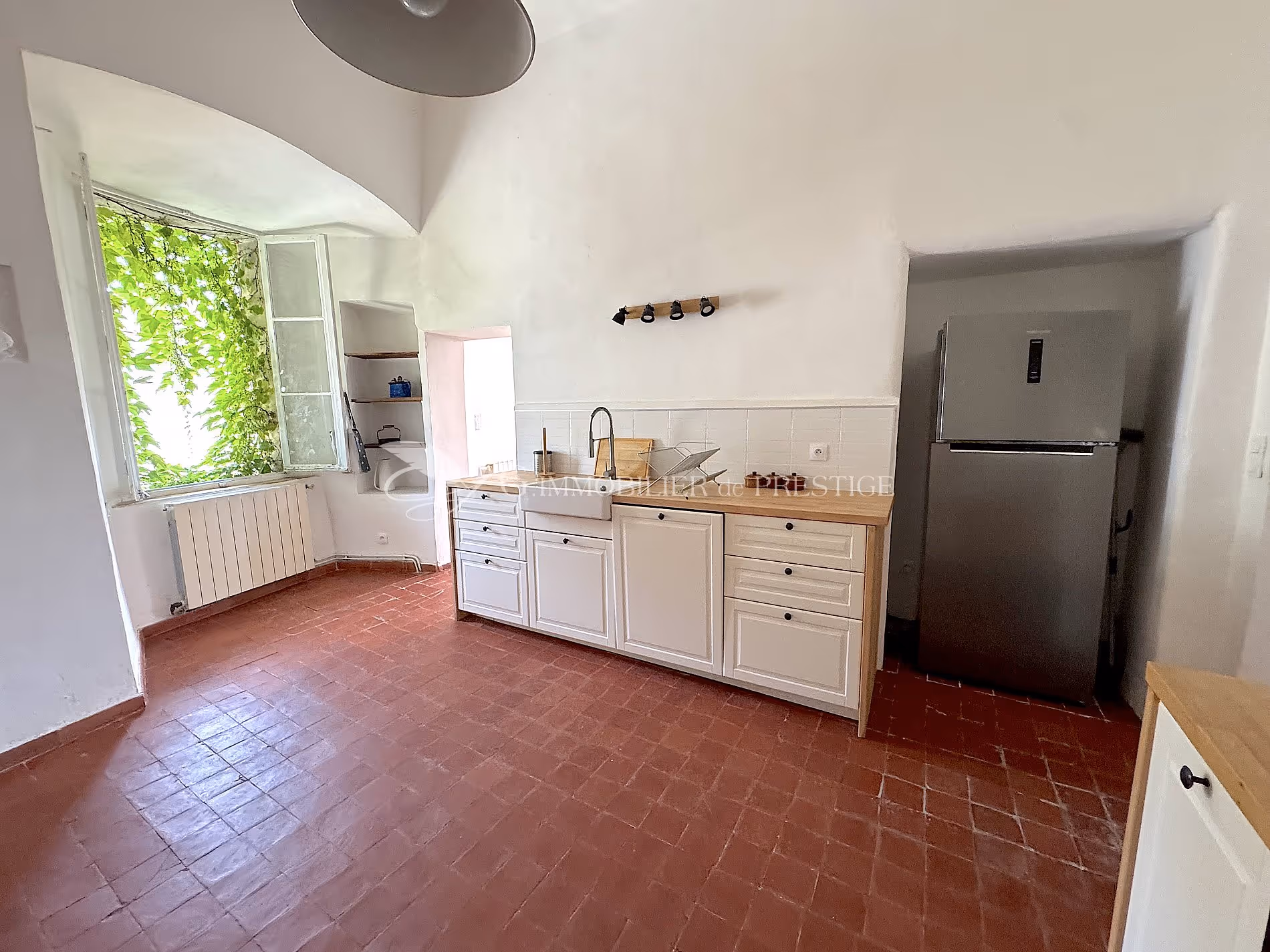 une cuisine authentique et équipée au sol en tomettes ouverte sur une fenêtre verdoyante au sud,
