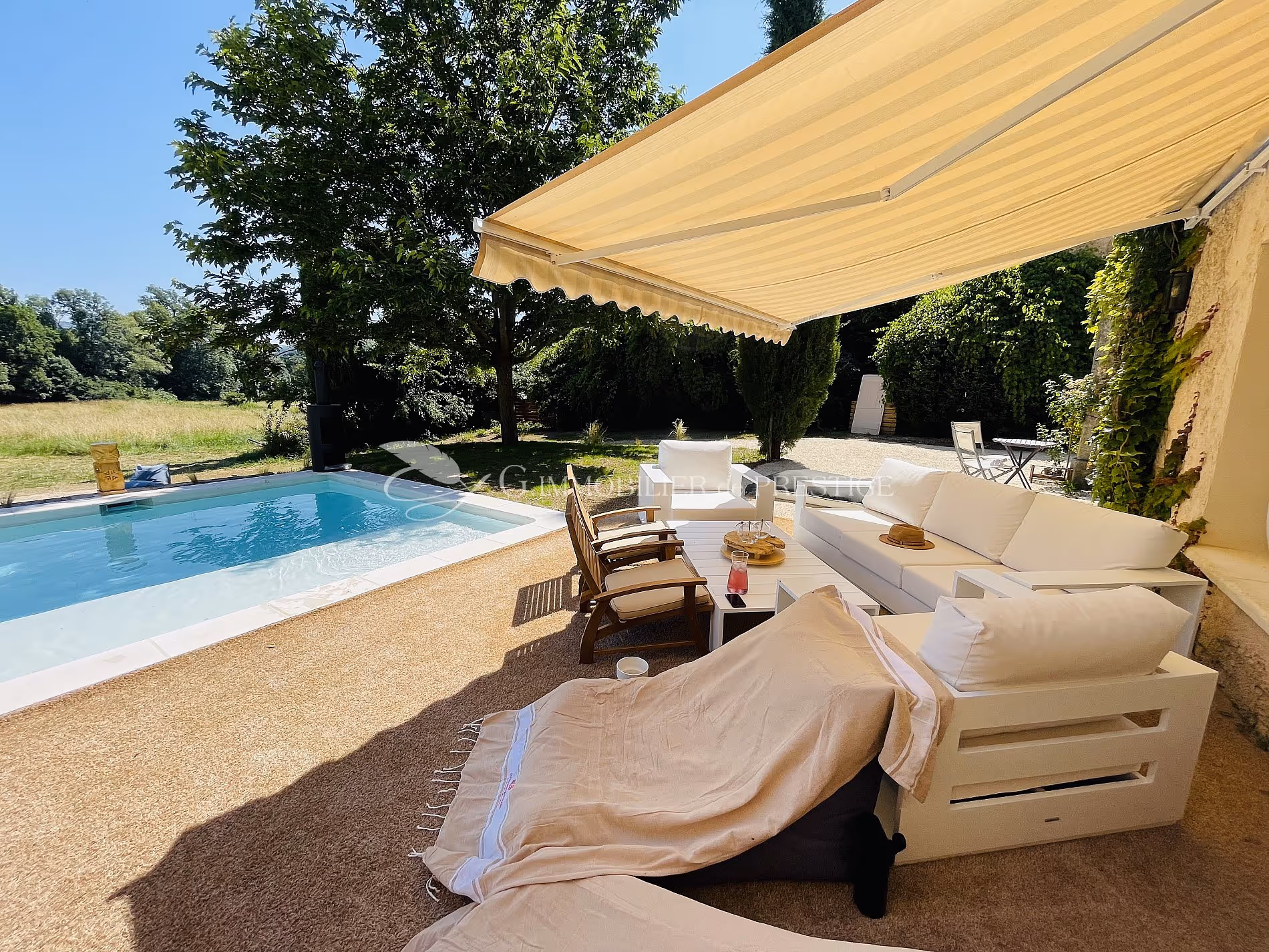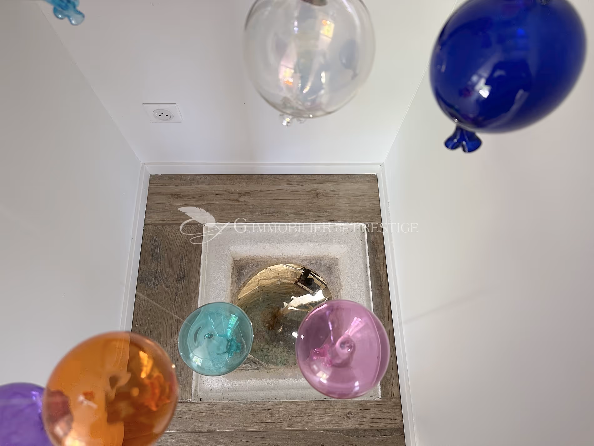 cette bâtisse de 250 m2 dont 90 m2 de combles aménageables a été restaurée en 2021 propose une architecture épurée avec des matériaux anciens comme le four à pain ancestral élément de décoration dans l'entrée au haut plafond et "une lucarne de sol " qui permet de voir couler la source, richesse inestimable de la propriété.