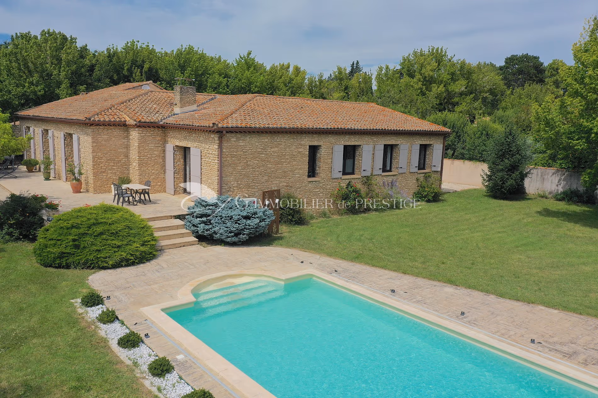 Depuis le salon/salle à manger on accède au jardin, à une terrasse et à la piscine d'eau salée .