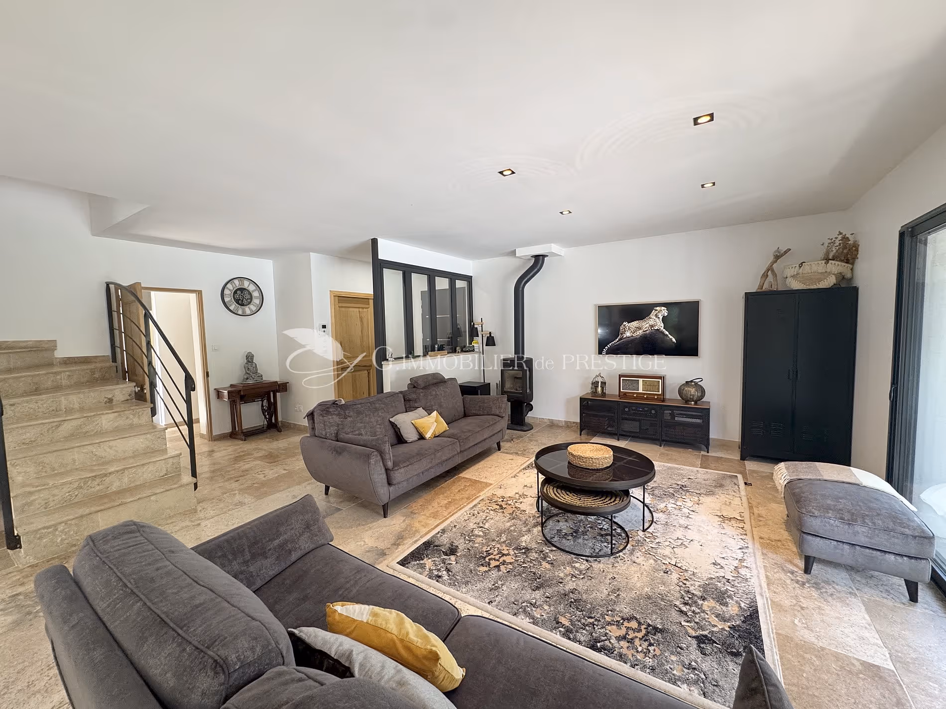 une vaste pièce de vie de 80 m2 tournée vers le jardin et la piscine. Baignée de lumière par les larges baies vitrées, elle a été conçue dans une ambiance chaleureuse. Le salon s'organise autour d'un poêle à bois design.