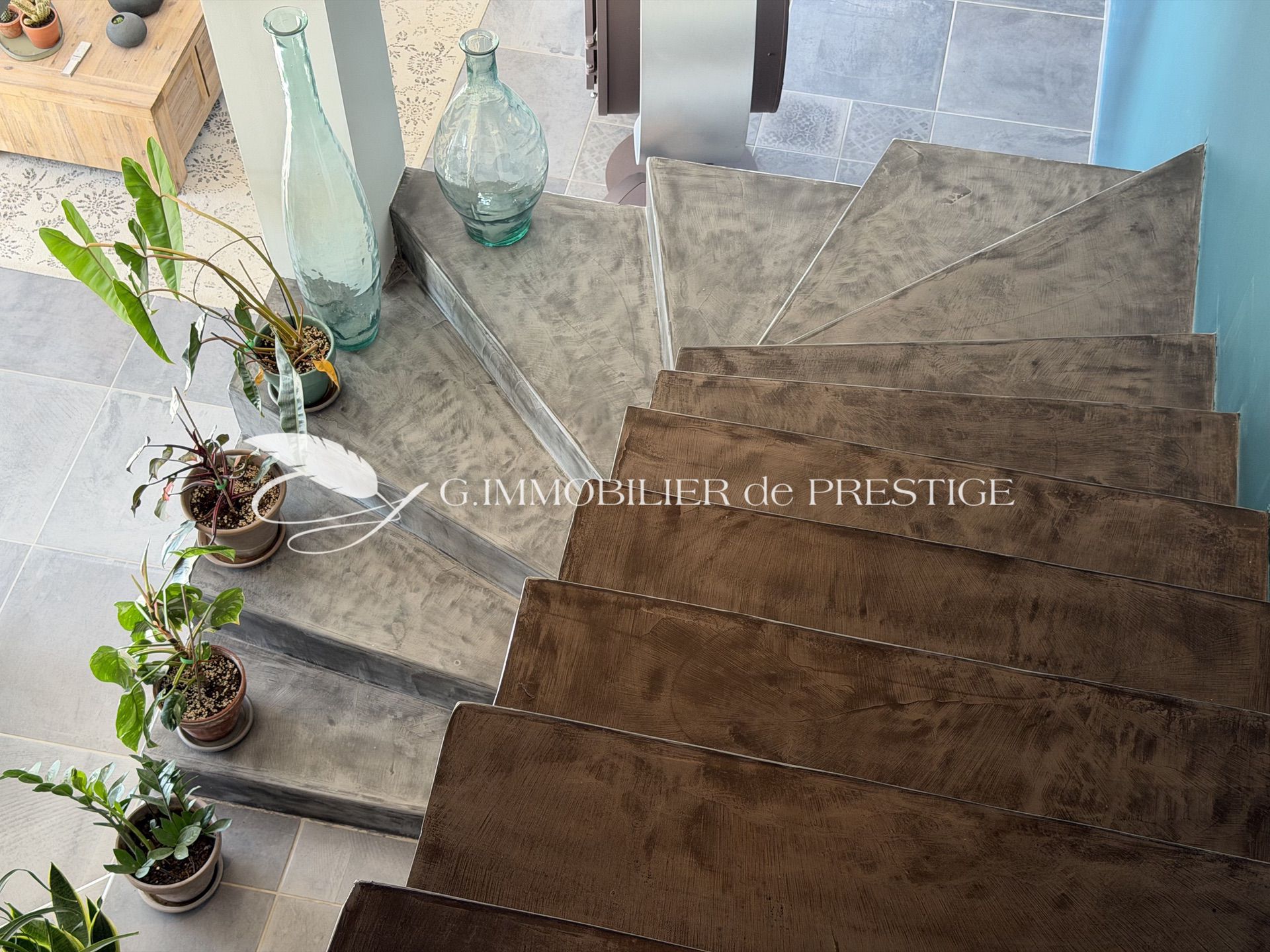 d'autre part, un escalier avec un garde-corps ciselé dessert une salle de billard de 45 m2 avec bar et baby-foot, véritable espace détente pour se retrouver pour des moments festifs.