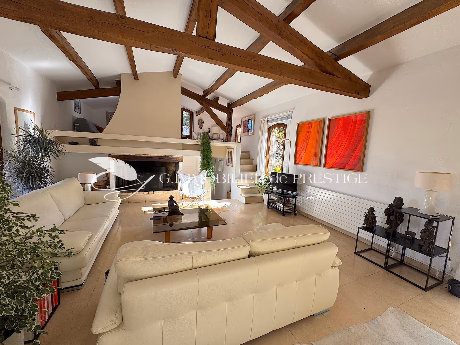On pénètre directement dans un superbe salon cathédrale de 31 m2 avec une élégante cheminée et une mezzanine qui lui donne une profondeur supplémentaire. Cette mezzanine ouvre sur un solarium de 18 m2 avec une vue panoramique sur les collines et la forêt.