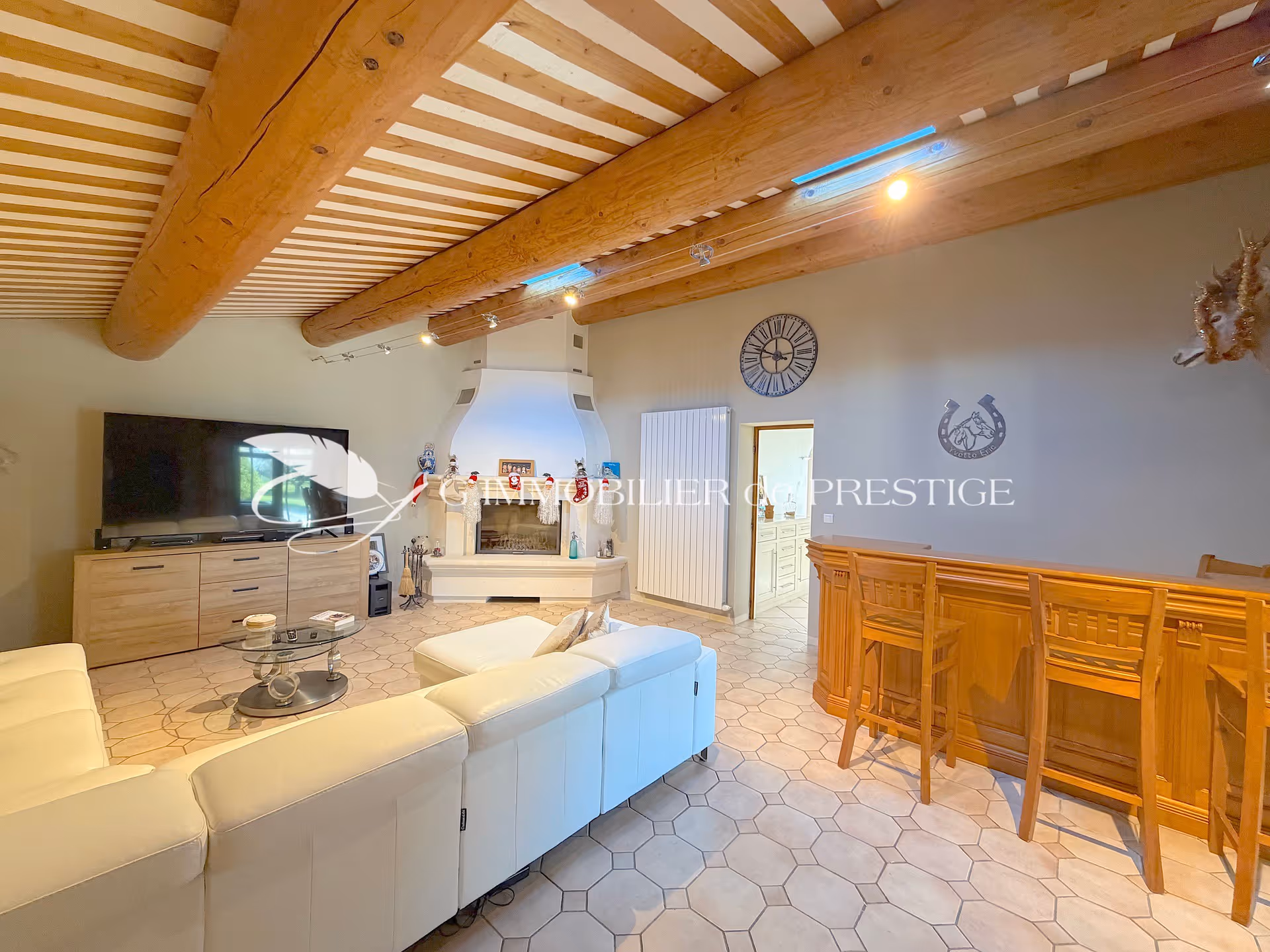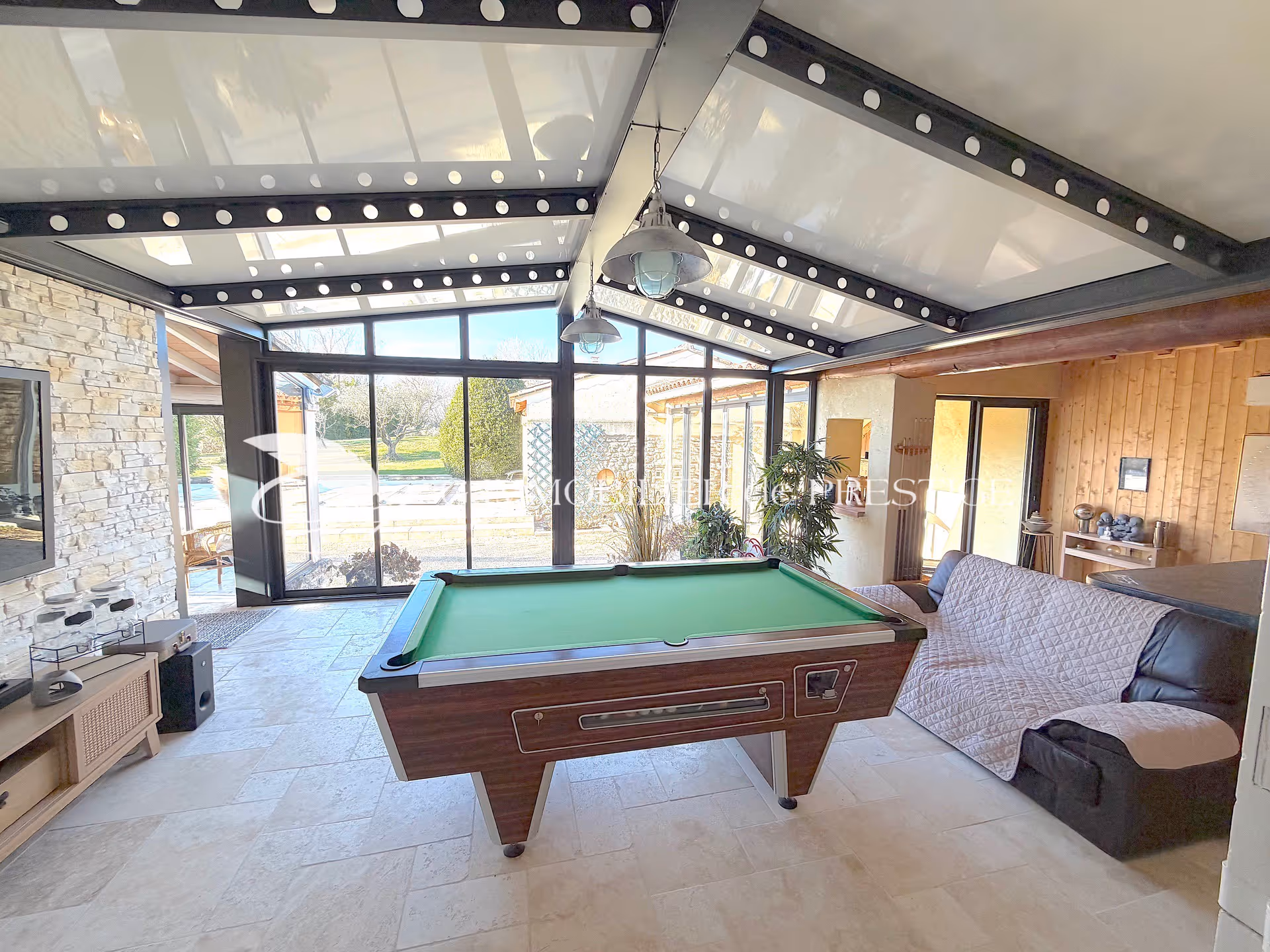 Un salon/cheminée de 40 m2 prolongé par une salle de billard en véranda et un jacuzzi dans un espace lumineux de 70m2.