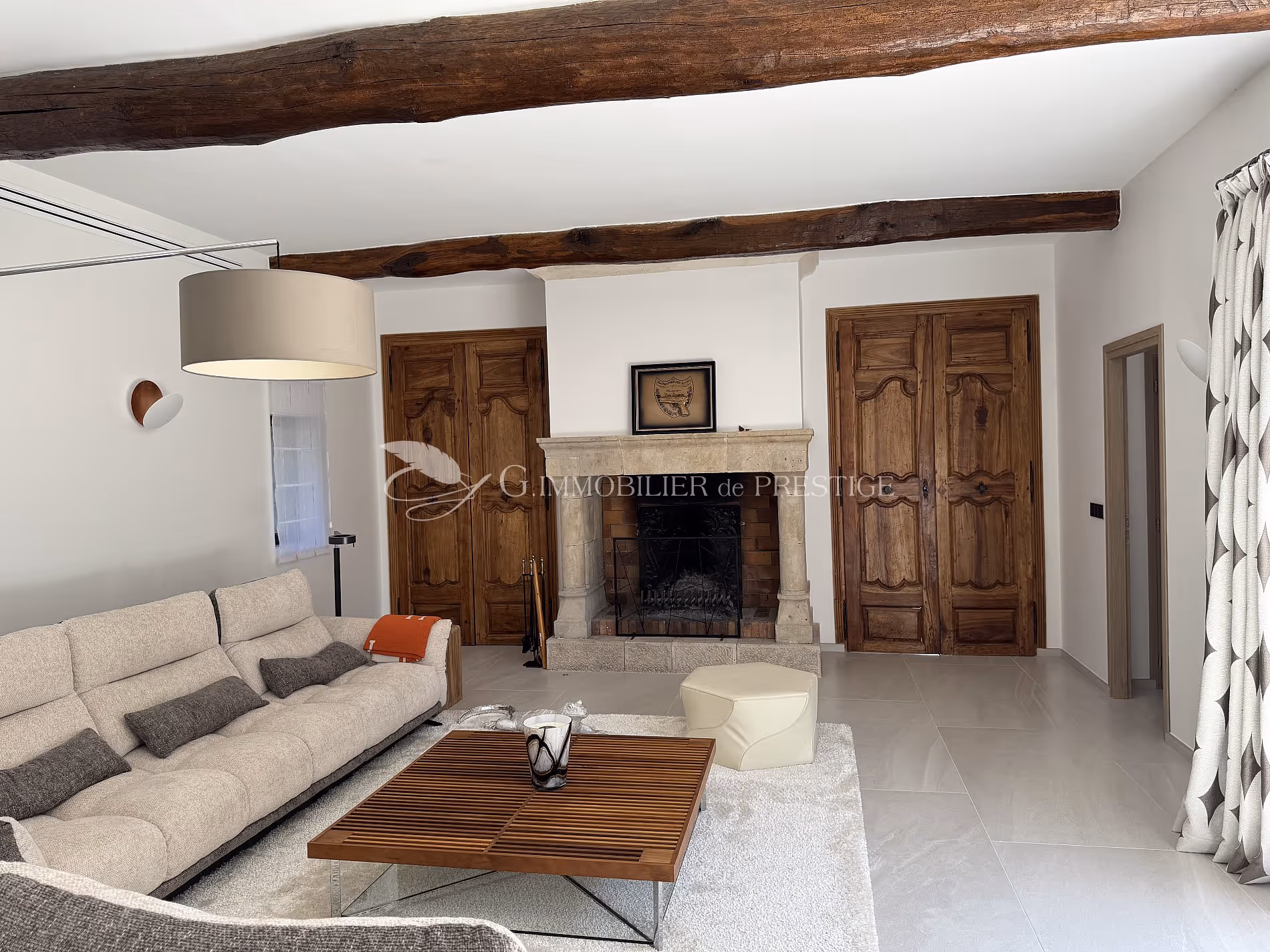 D'autre part, un salon principal marie avec subtilité les poutres apparentes en bois massif, une cheminée ancienne en pierre et une décoration contemporaine soignée. Le mobilier aux lignes épurées s'intègre parfaitement dans cet univers feutré.