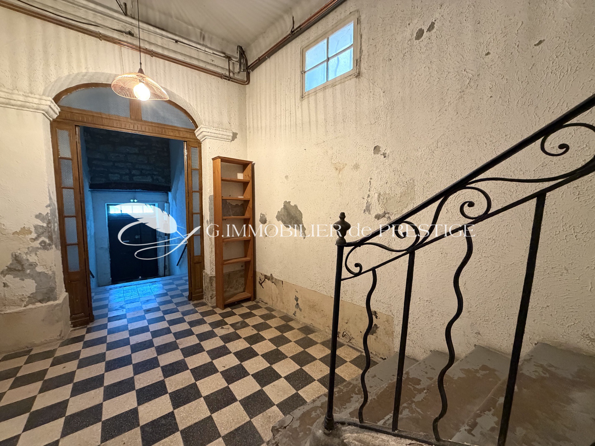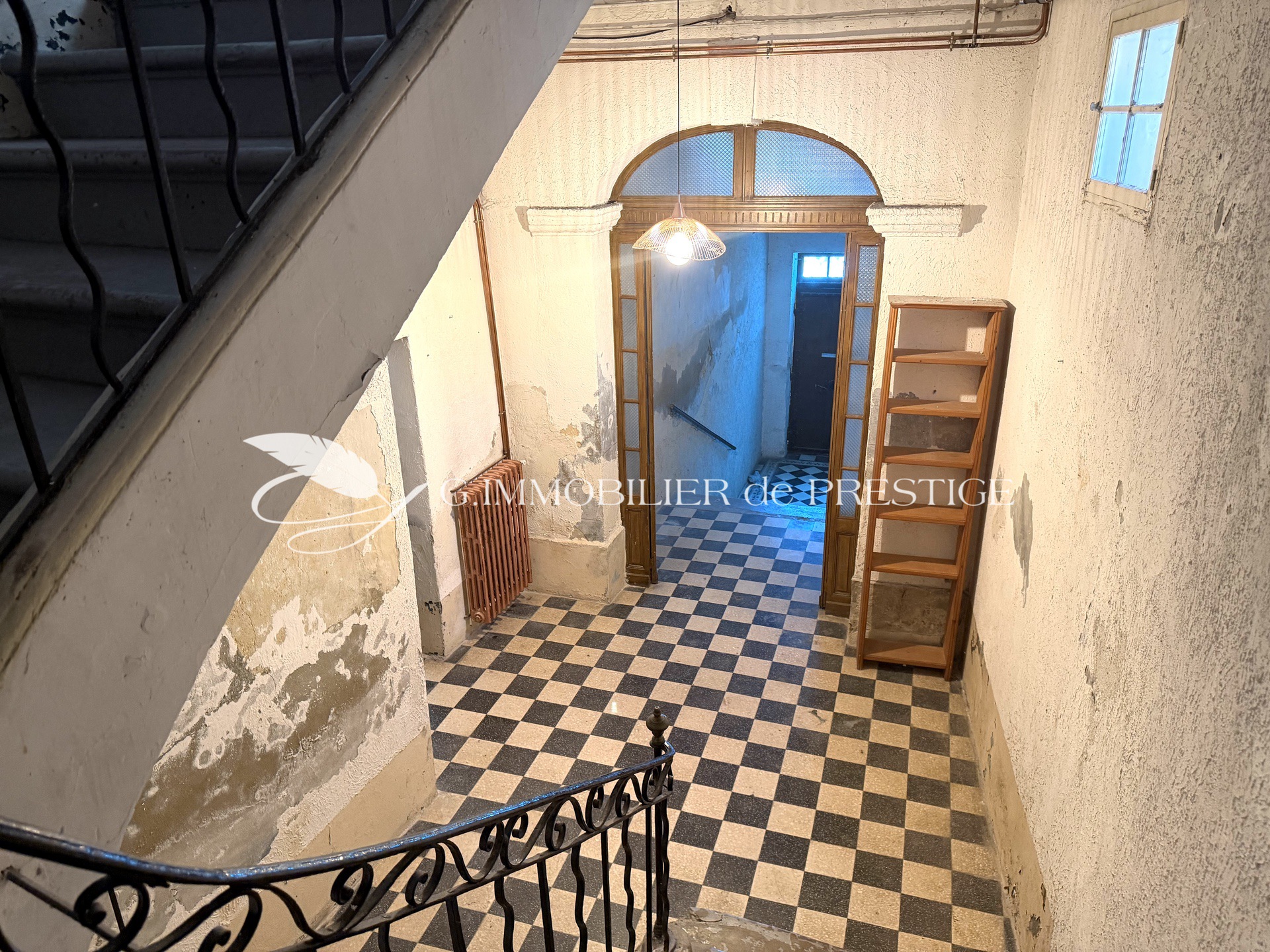 Au rez de chaussée, un accès rue avec une entrée principale monumentale au beau carrelage damier noir et blanc, sa salle de garde d’antan, son accès au garage autrefois utilisé pour les chevaux.
