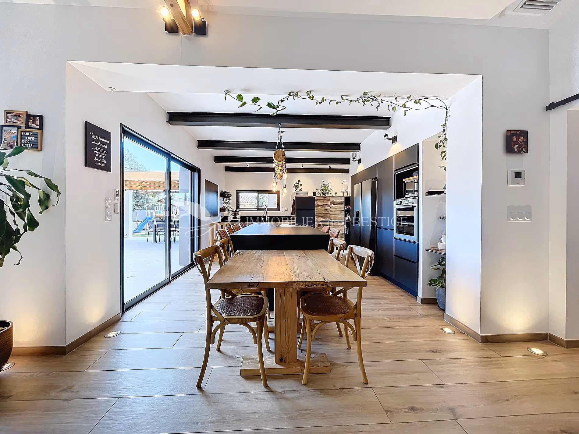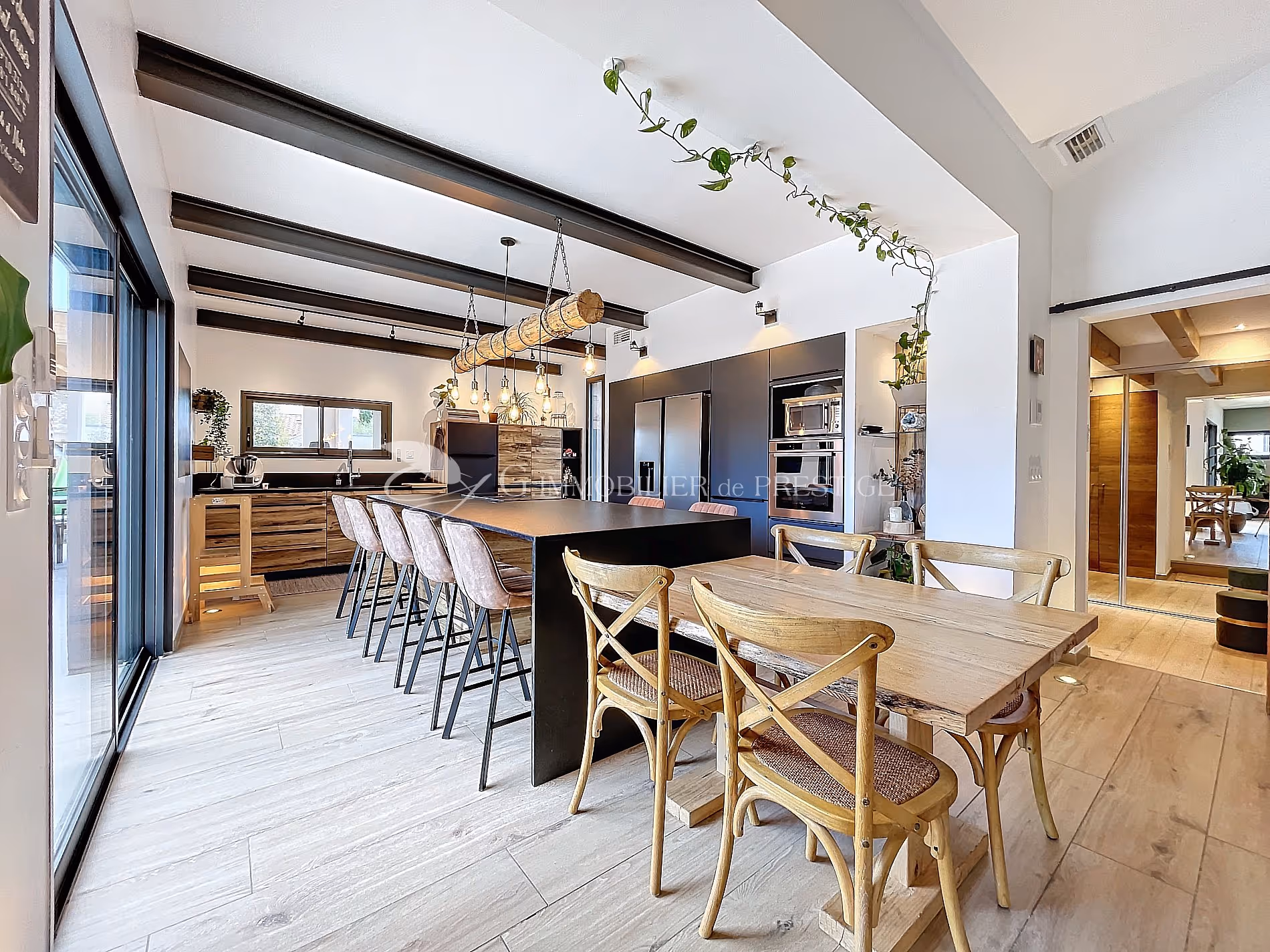 Opening onto the terrace and the outside through its two large windows, it benefits from a large fitted kitchen with a very large central island.