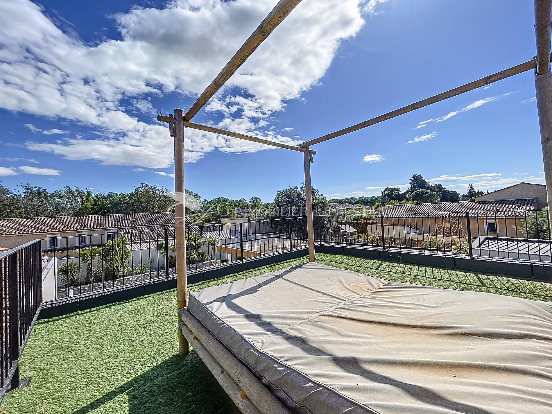 Parents, for their part, will enjoy a private and intimate space upstairs. Charming attic office, 17m² master suite equipped with a bath and a toilet, opening onto a panoramic private terrace, with a breathtaking view of the Dentelles de Montmirail and Mont-Ventoux.
