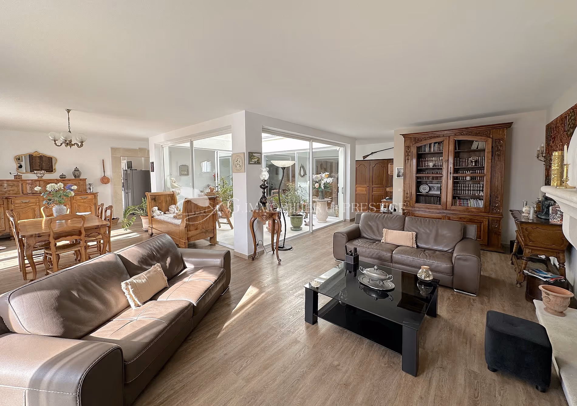 Un vaste séjour avec une cheminée, un sublime patio de 16 m2 qui s'ouvre à ciel ouvert et décuple la lumière, une cuisine équipée, trois belles chambres et deux salles de bain dont une avec douche.