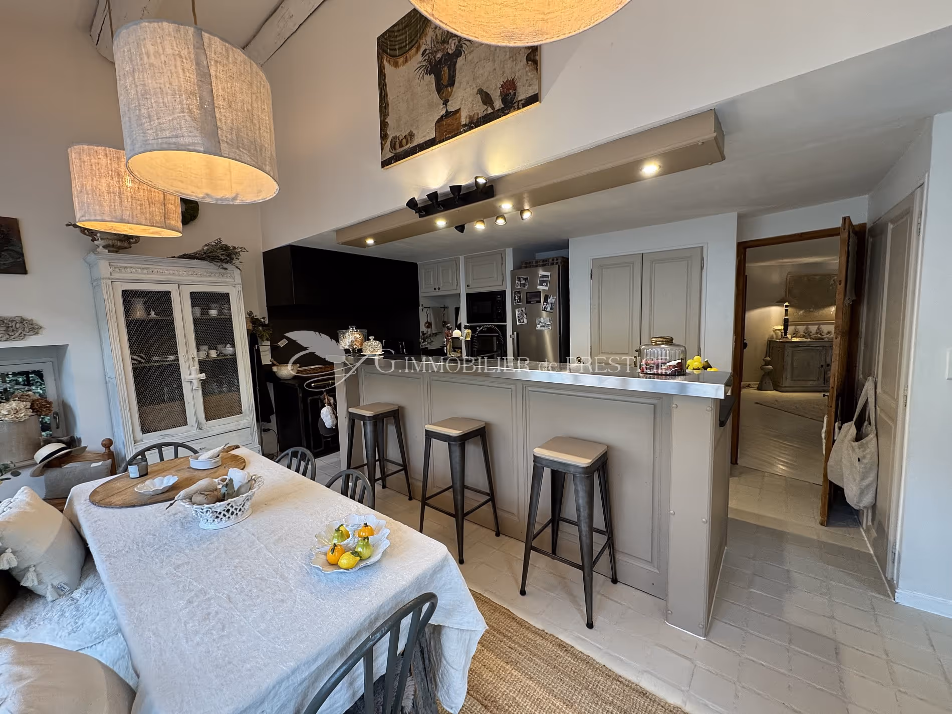 La cuisine s'ouvre entièrement grâce à de belles ouvertures en fer forgé.