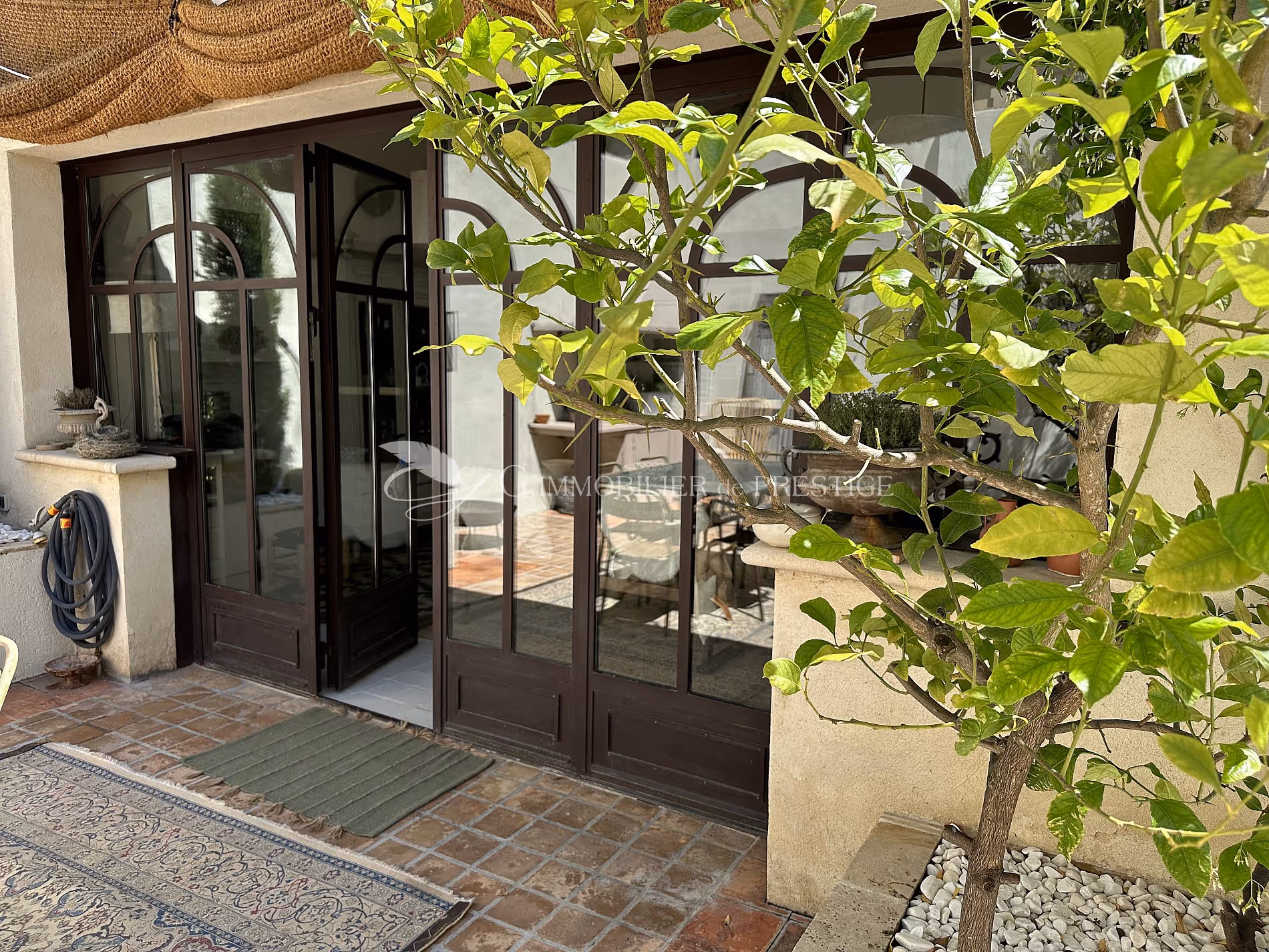 L'espace jardin/terrasse ombragé par un store profite d'un espace barbecue. Un bel olivier et des teintes pastels aux accents médittéranéens créent un environnement doux et agréable.