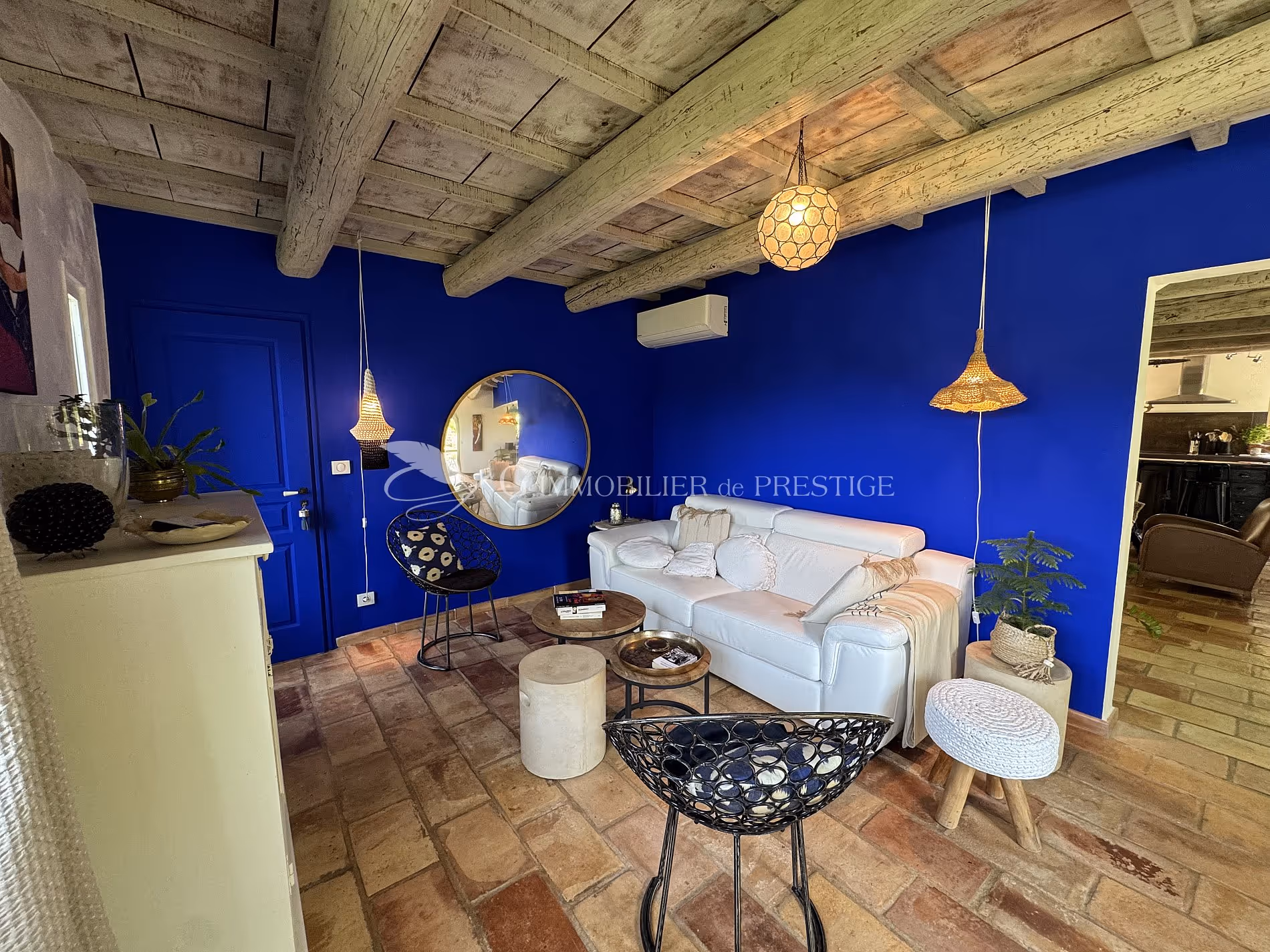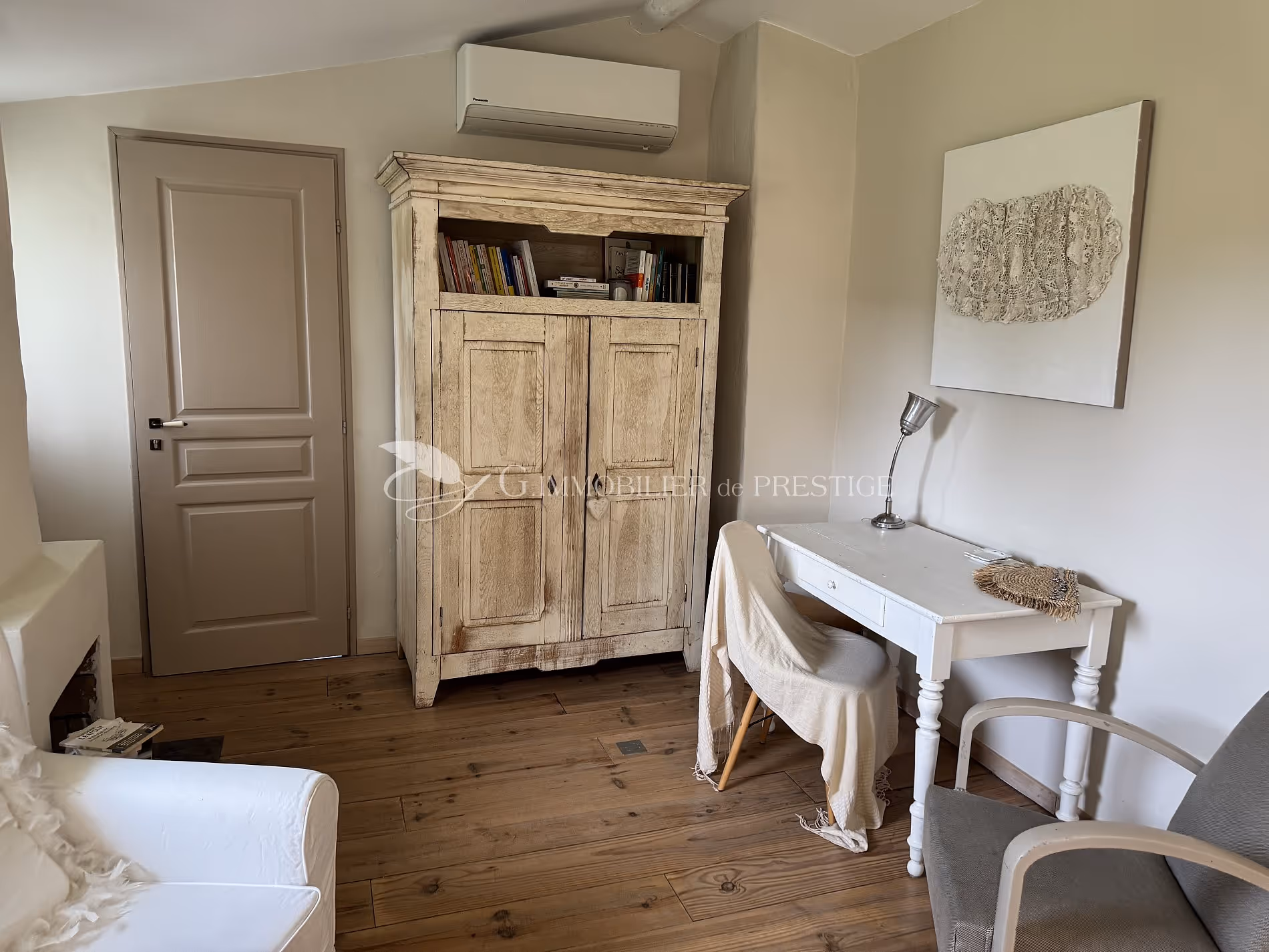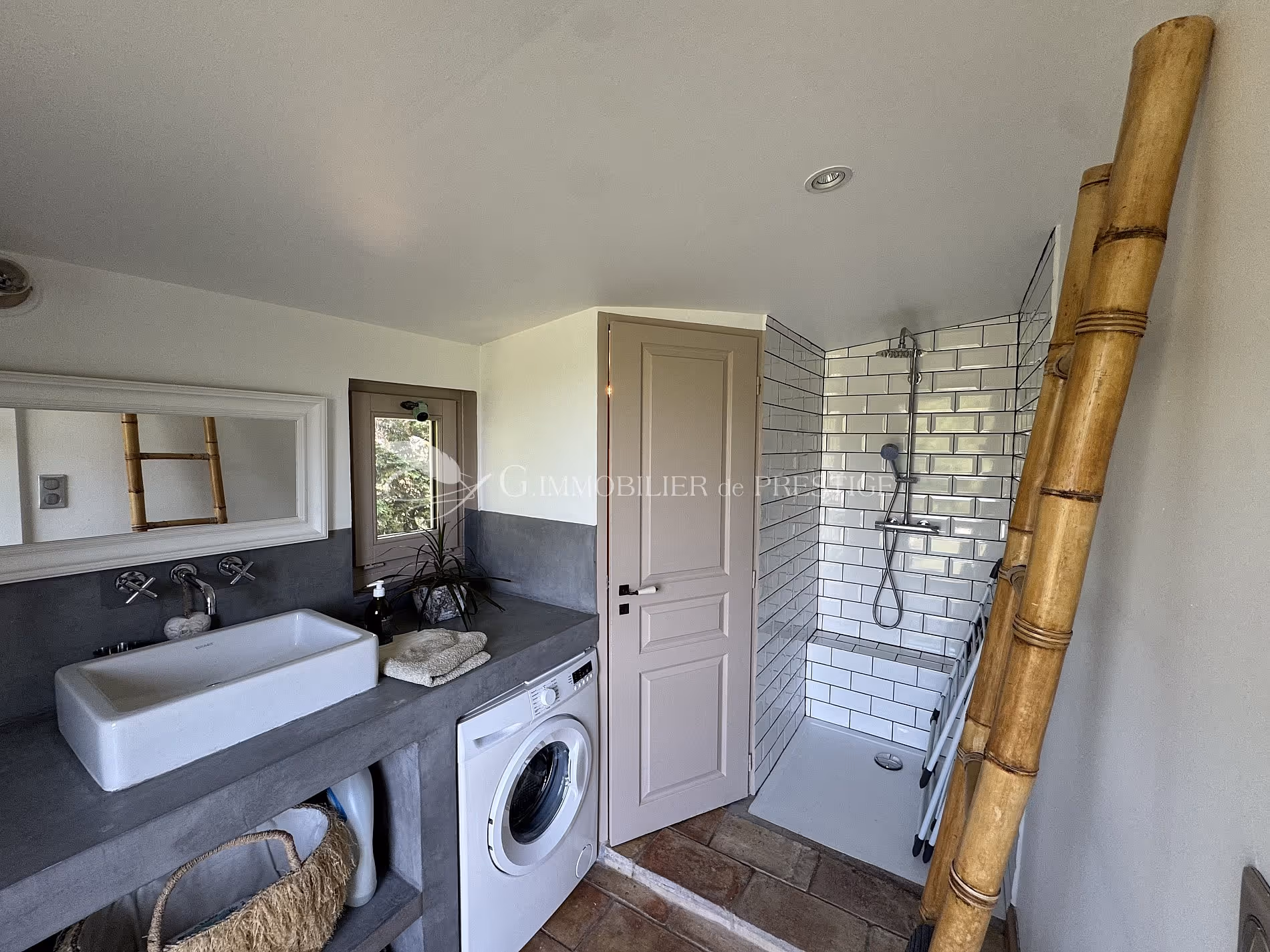 The main house, spanning 147 m², is cozy, warm, and entirely on one level. The living spaces include a dining room/library, an open kitchen flowing into a living room with a fireplace, and a second living room that can be transformed into a bedroom with an existing bathroom. Terracotta floors, plastered walls, and exposed beam ceilings create a charming, authentic Provençal atmosphere. The home is equipped with double-glazed windows with traditional Provençal shutters, reversible heating, air-conditioning, and a JOTUL stove. Upstairs, a spacious master suite with elegant en-suite bathroom and a second bedroom with shower room offer comfort and privacy, complemented by a dressing room with custom doors and antique shutters.