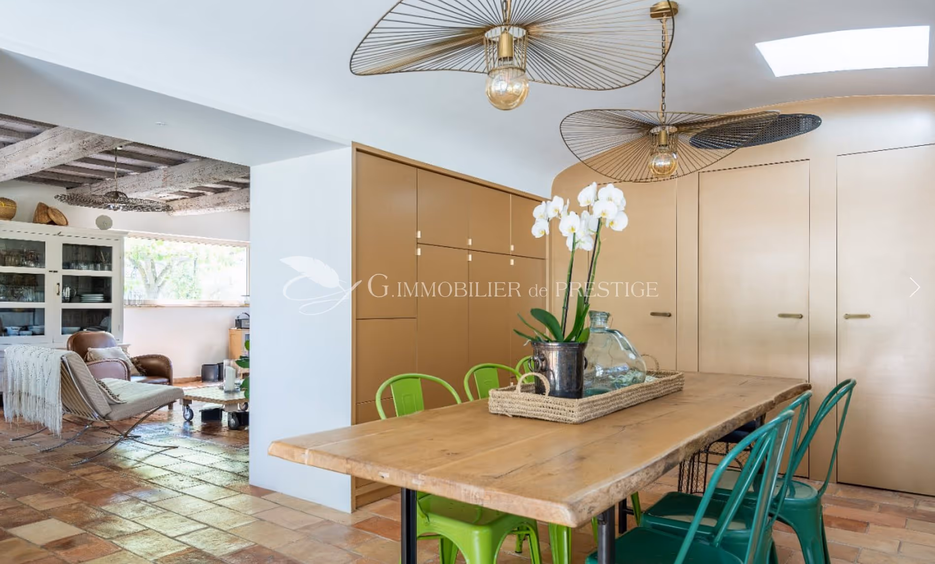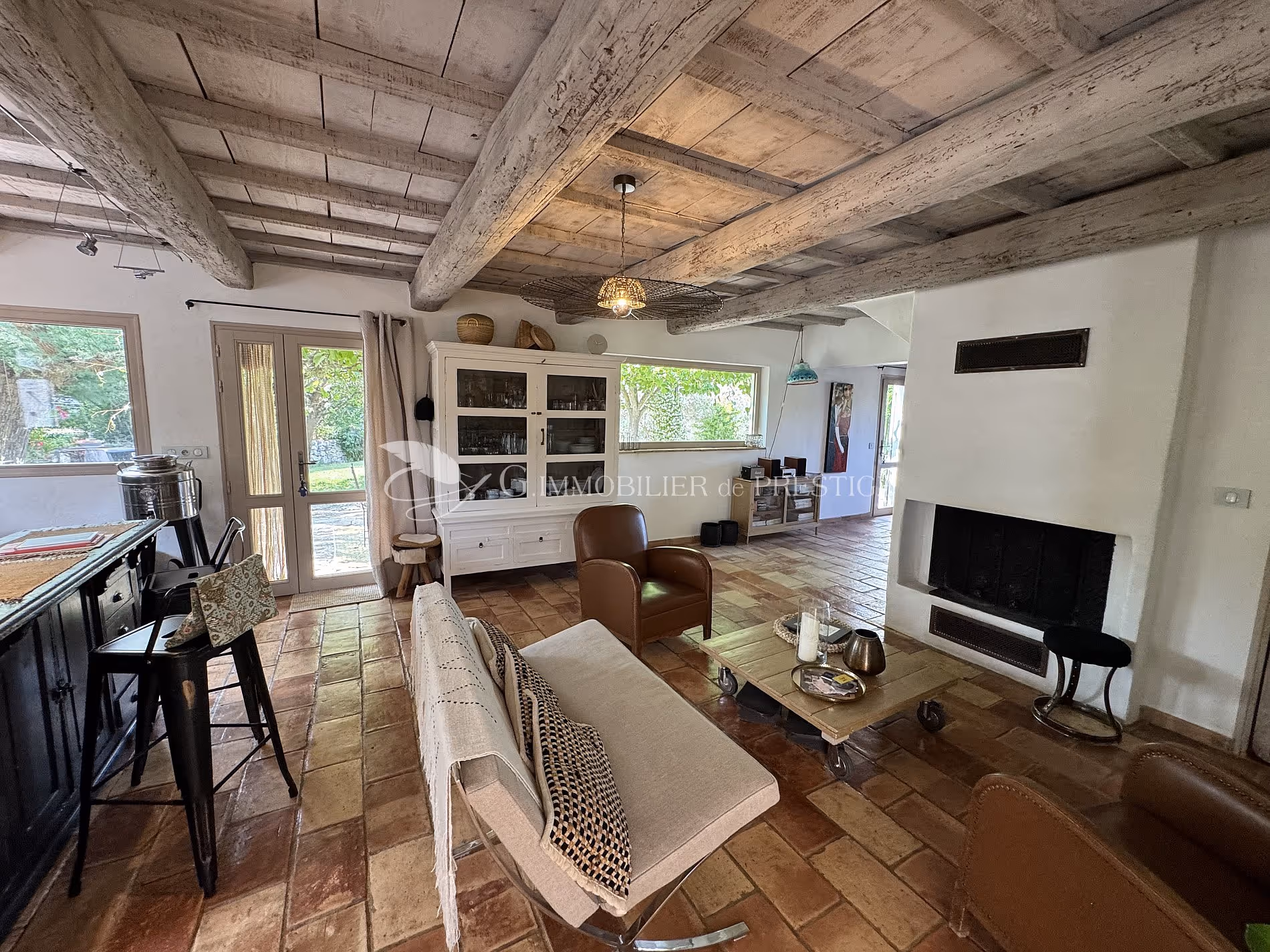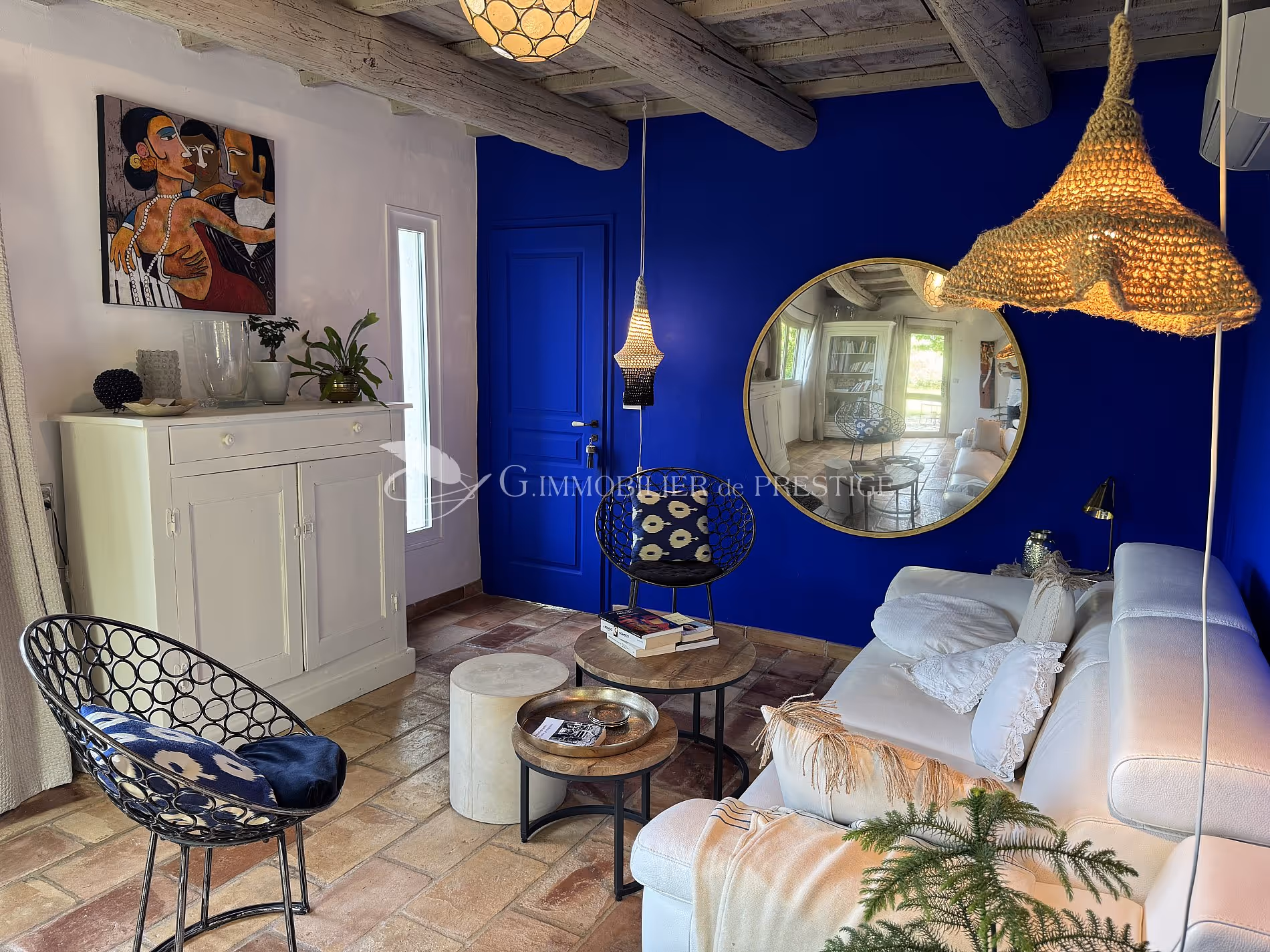 The main house, spanning 147 m², is cozy, warm, and entirely on one level. The living spaces include a dining room/library, an open kitchen flowing into a living room with a fireplace, and a second living room that can be transformed into a bedroom with an existing bathroom. Terracotta floors, plastered walls, and exposed beam ceilings create a charming, authentic Provençal atmosphere. The home is equipped with double-glazed windows with traditional Provençal shutters, reversible heating, air-conditioning, and a JOTUL stove. Upstairs, a spacious master suite with elegant en-suite bathroom and a second bedroom with shower room offer comfort and privacy, complemented by a dressing room with custom doors and antique shutters.