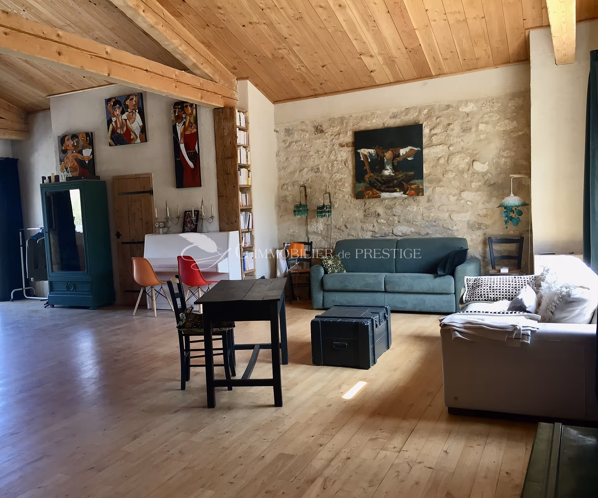 The shepherd’s house, approximately 100 m², was fully renovated five years ago in a contemporary loft style. It features a large open-plan room with parquet floors, high ceilings, a fireplace, and a private bathroom, along with a generous terrace perfect for convivial dining. Fully independent from the main house with its own entrance, it is ideal as a studio for an artist, guest accommodation, children’s space, or to generate rental income.