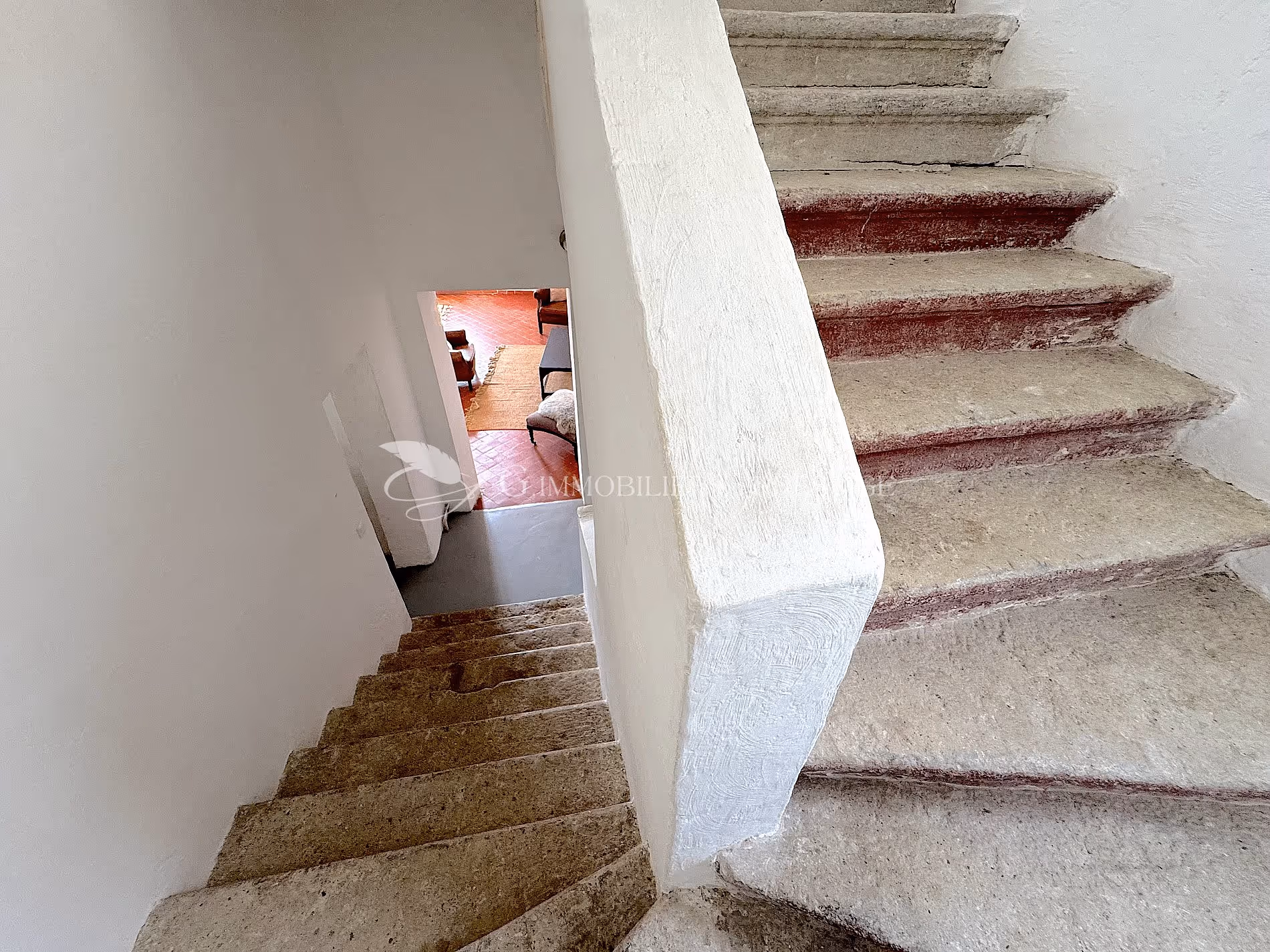 A superb and wide staircase made of raw concrete and then stone serves all floors.