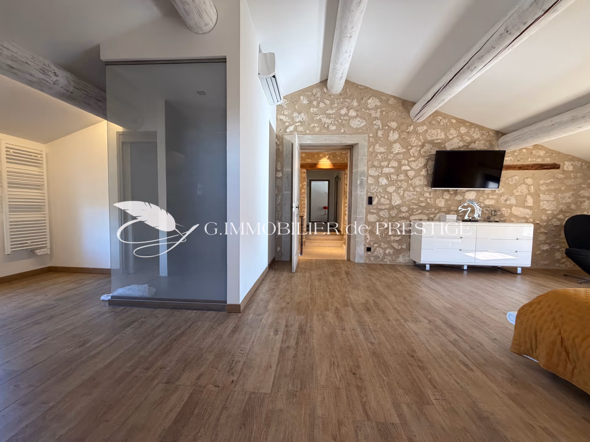 High-end amenities combine exposed stone, visible beams, generous ceiling heights, stone lintels and surrounds with a contemporary aesthetic expressed through the kitchen design, large-format modern tiling and bespoke furnishings. A restoration that truly enhances the character of the original building.