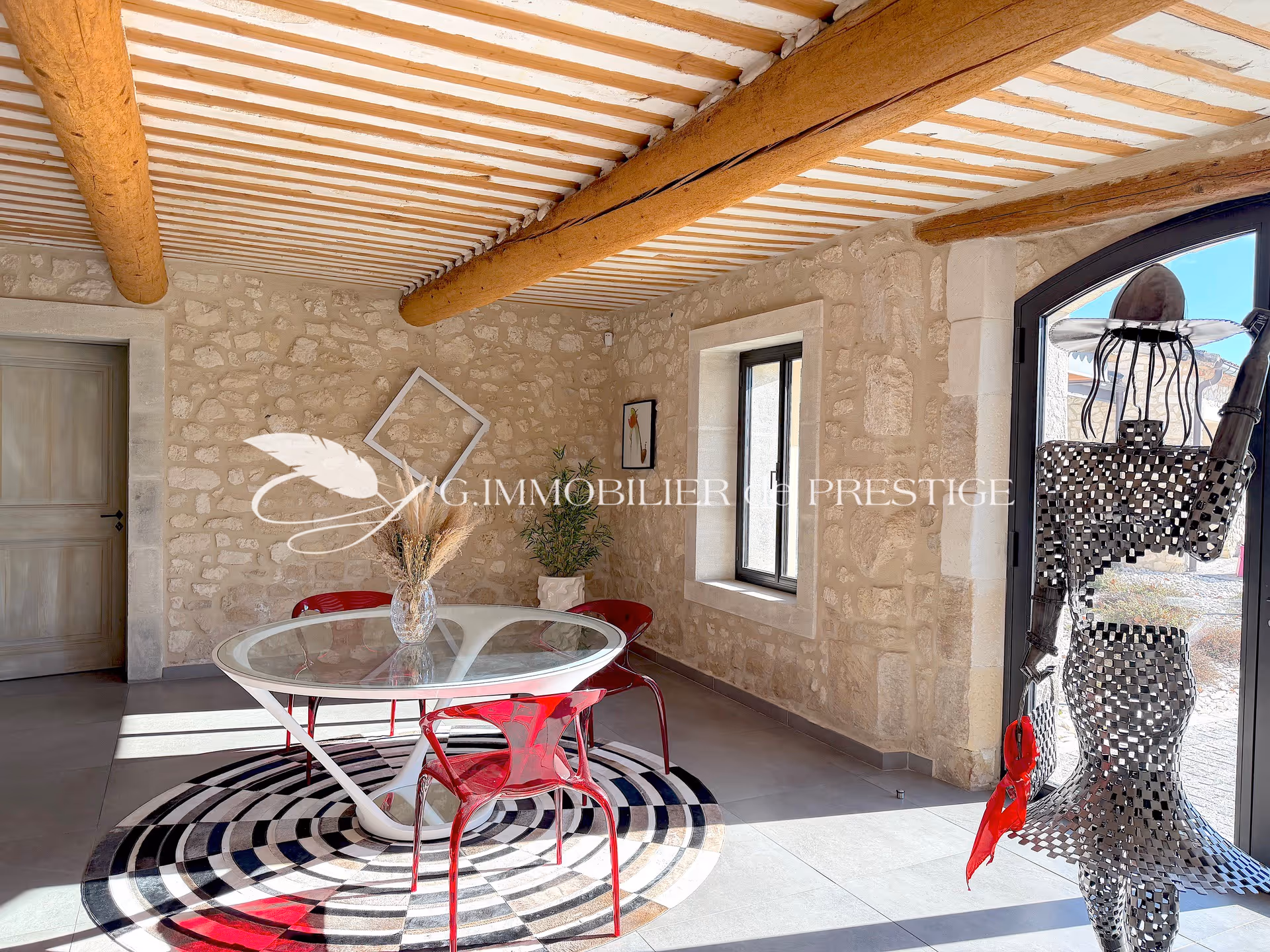 To the west of the mas, a garden dining room designed as a summer kitchen features a cathedral-style exposed timber roof and large picture windows that blur the boundary between indoors and outdoors. This space offers an exceptional reception area, outdoors yet directly connected to the house, with immediate access to the utility kitchen.