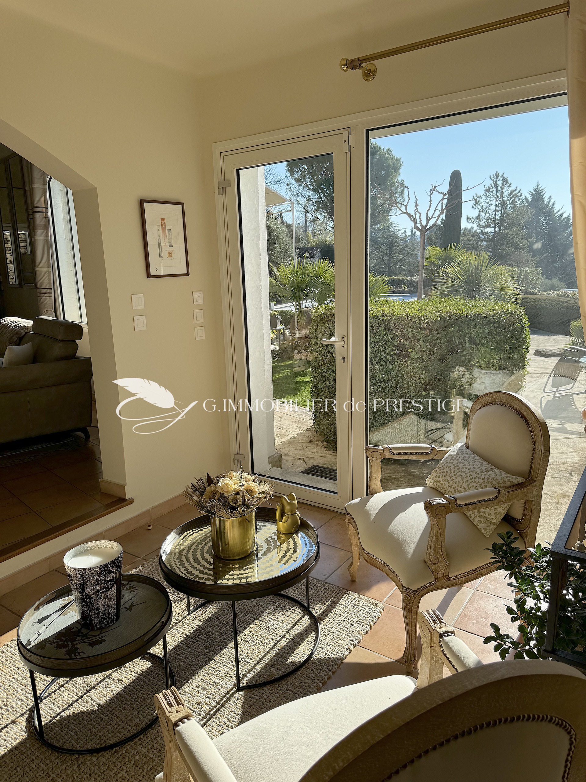 Le rez de jardin baigné de lumière se décline en divers espaces confortables et ouvre vers des terrasses ombragées et la piscine.