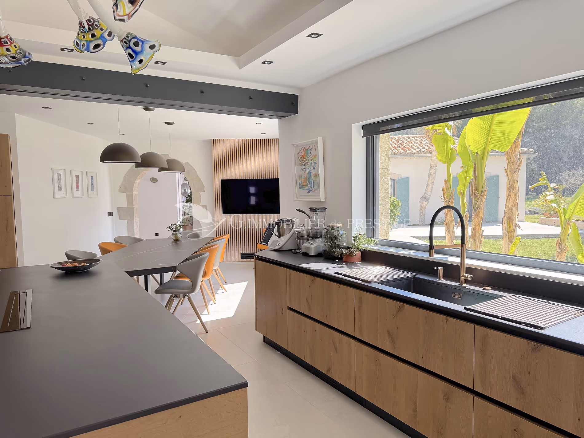 It opens directly onto the 60 m2 dining room on the park side. A chic and timeless marriage combining wood, metal, aluminum and firewood, this masterpiece in the home is an ideal and convivial reception space.