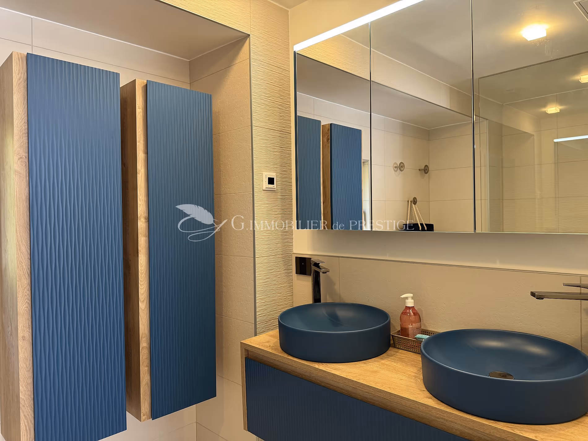 A second, more intimate living room, designed like a home cinema, offers a warm atmosphere thanks to upholstered furniture and a high-quality audiovisual installation.