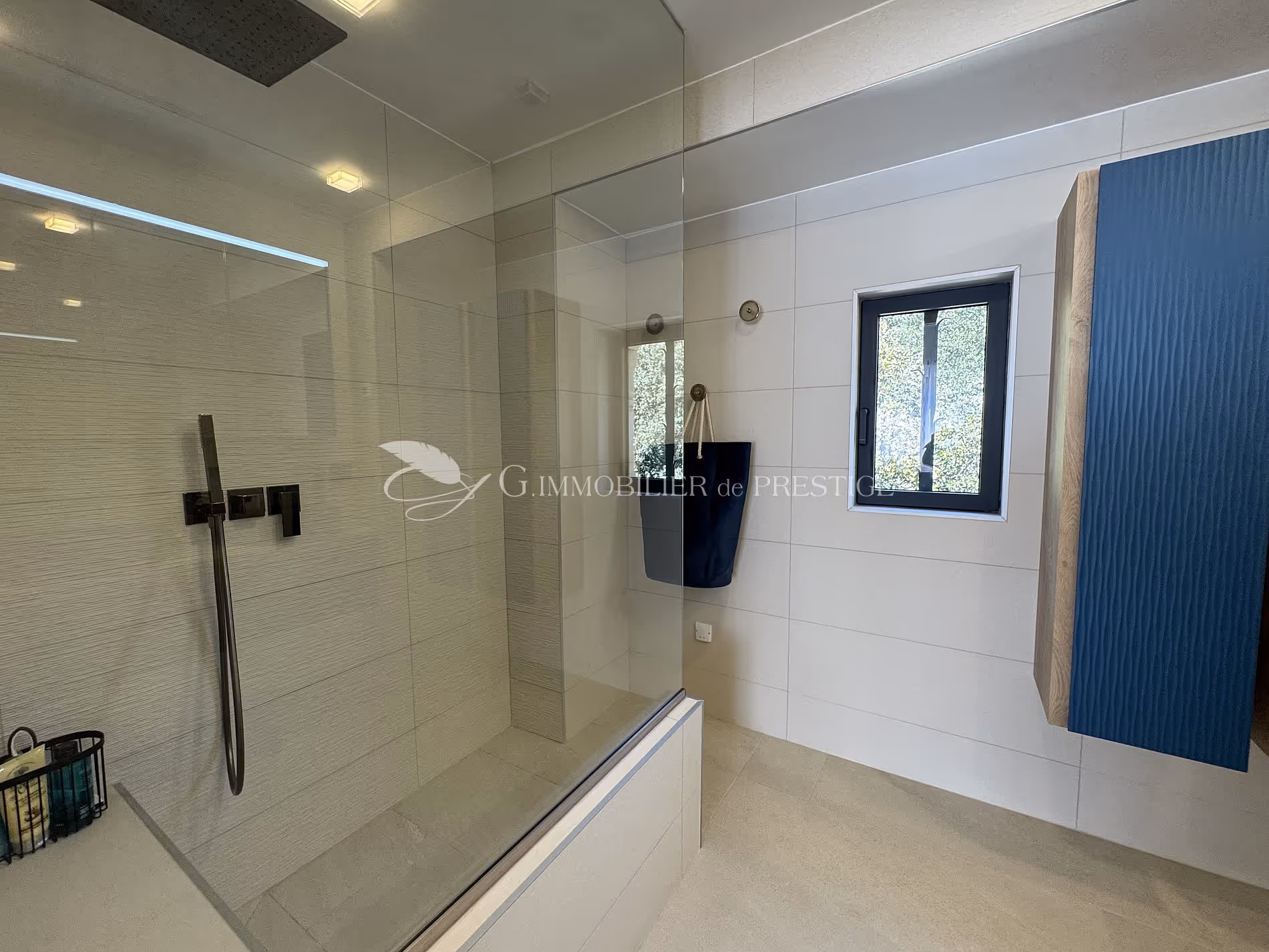 The master suite on the ground floor embodies the elegance of the property. All in natural colors, it offers absolute comfort in a soft atmosphere. A door opens directly to the textured marble bathroom with a bathtub and an Italian shower with a large built-in seat.