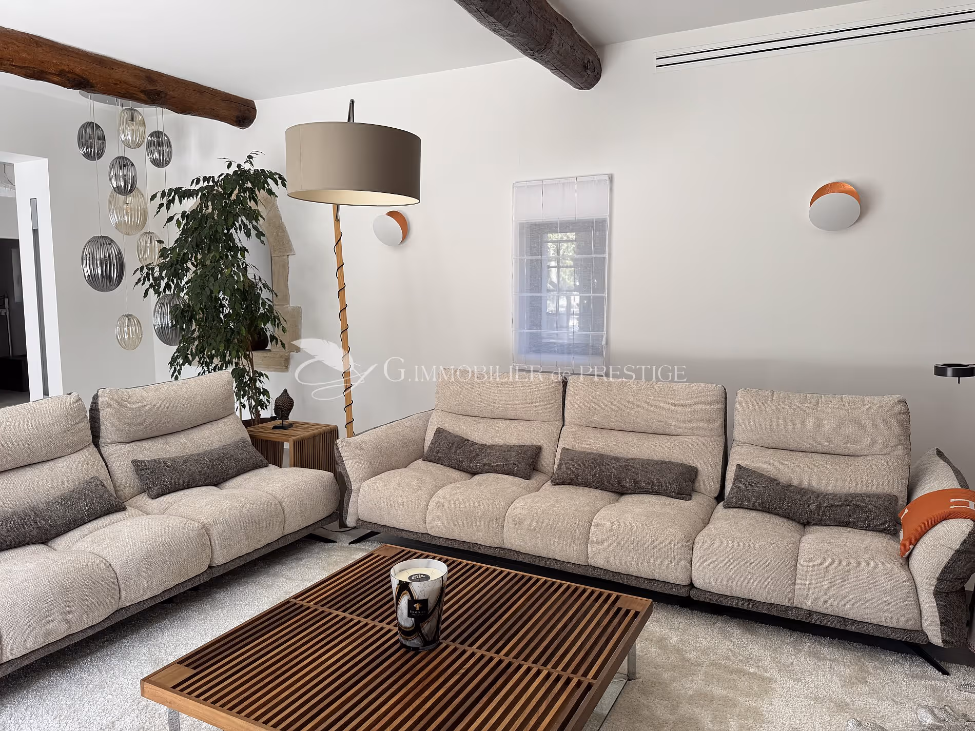 On the other hand, a main living room subtly combines exposed solid wood beams, an antique stone fireplace and stylish contemporary decor. The furniture with clean lines fits perfectly into this cozy universe.