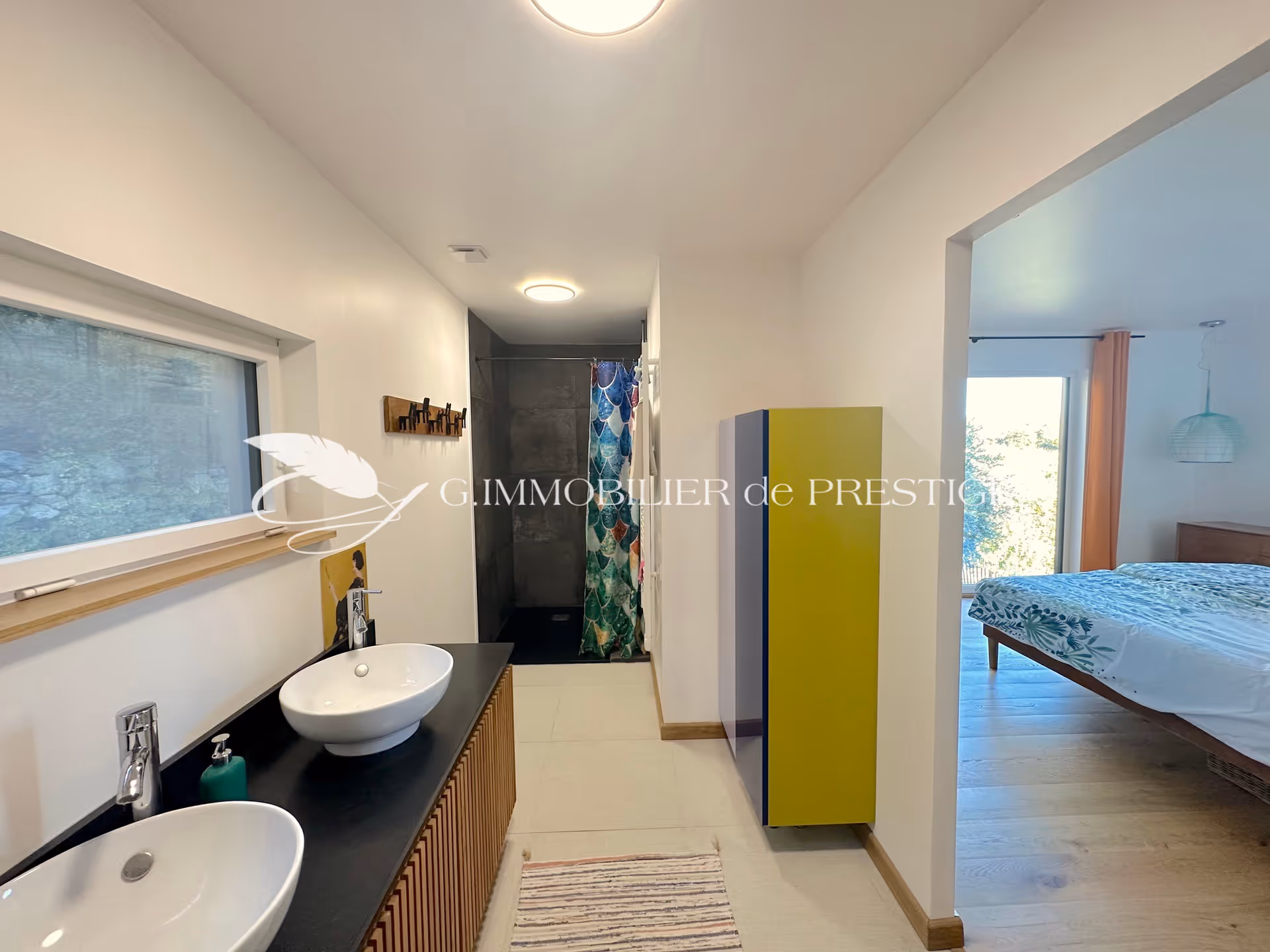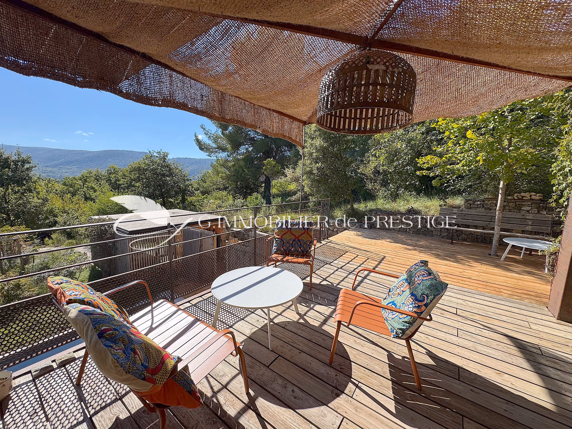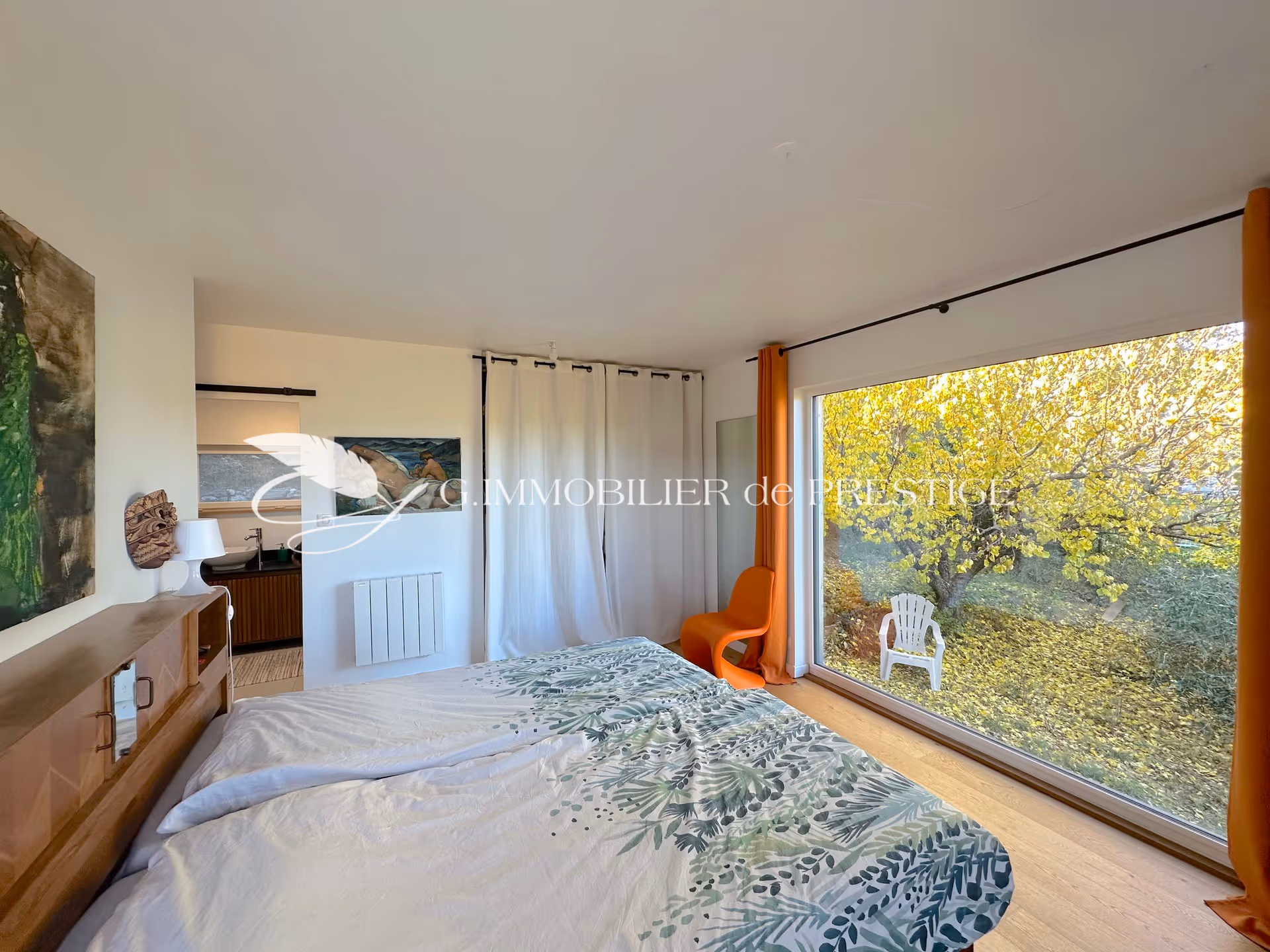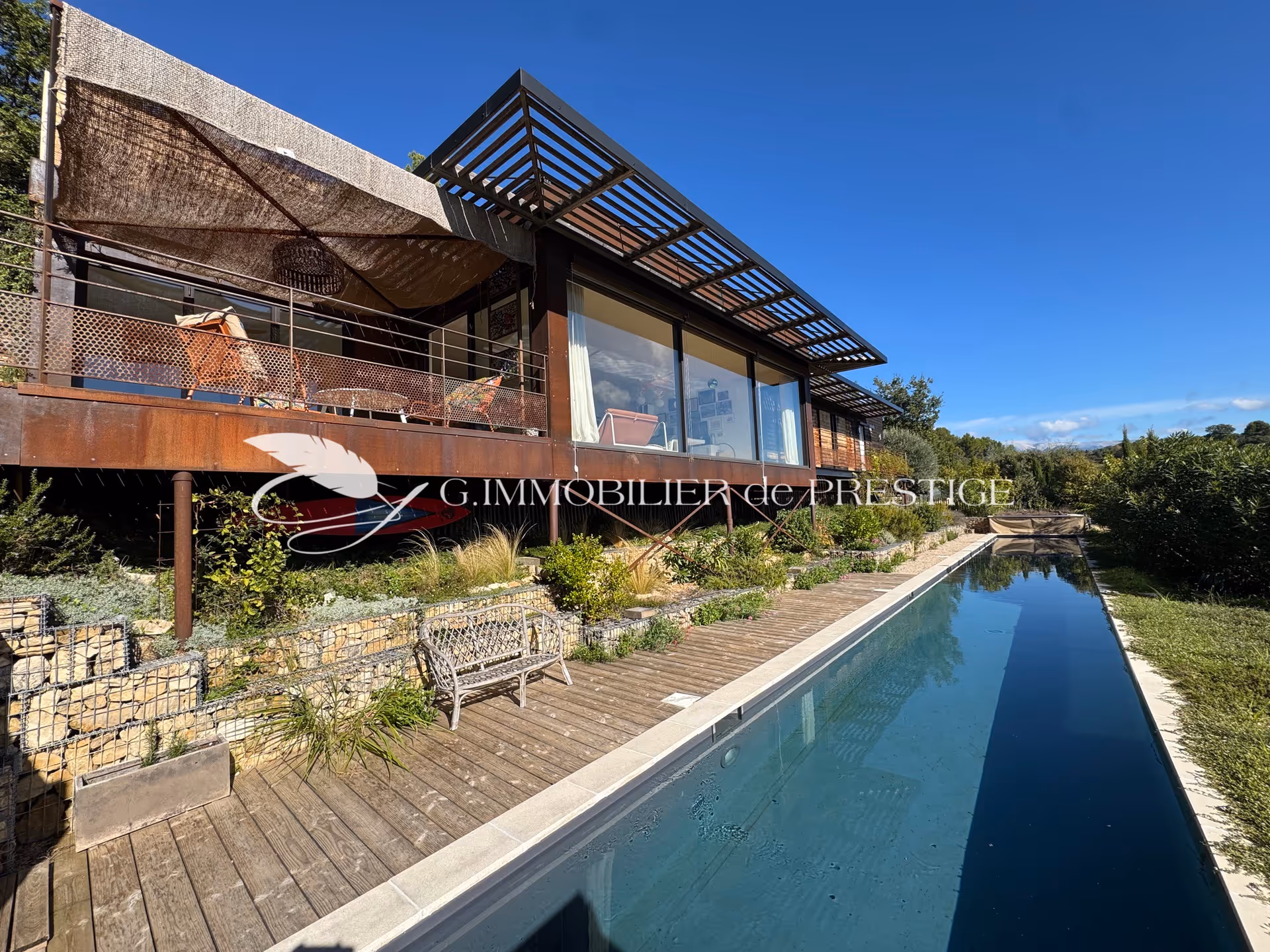 Set in a commanding position and built on stilts in 2019,this bold architect-designed villa blends perfectly into its naturalsurroundings. With its vast bay windows and striking lines, it overlooks astunning heated swimming lane (25 x 2.5 m) and offers breathtaking views of thesurrounding hills.